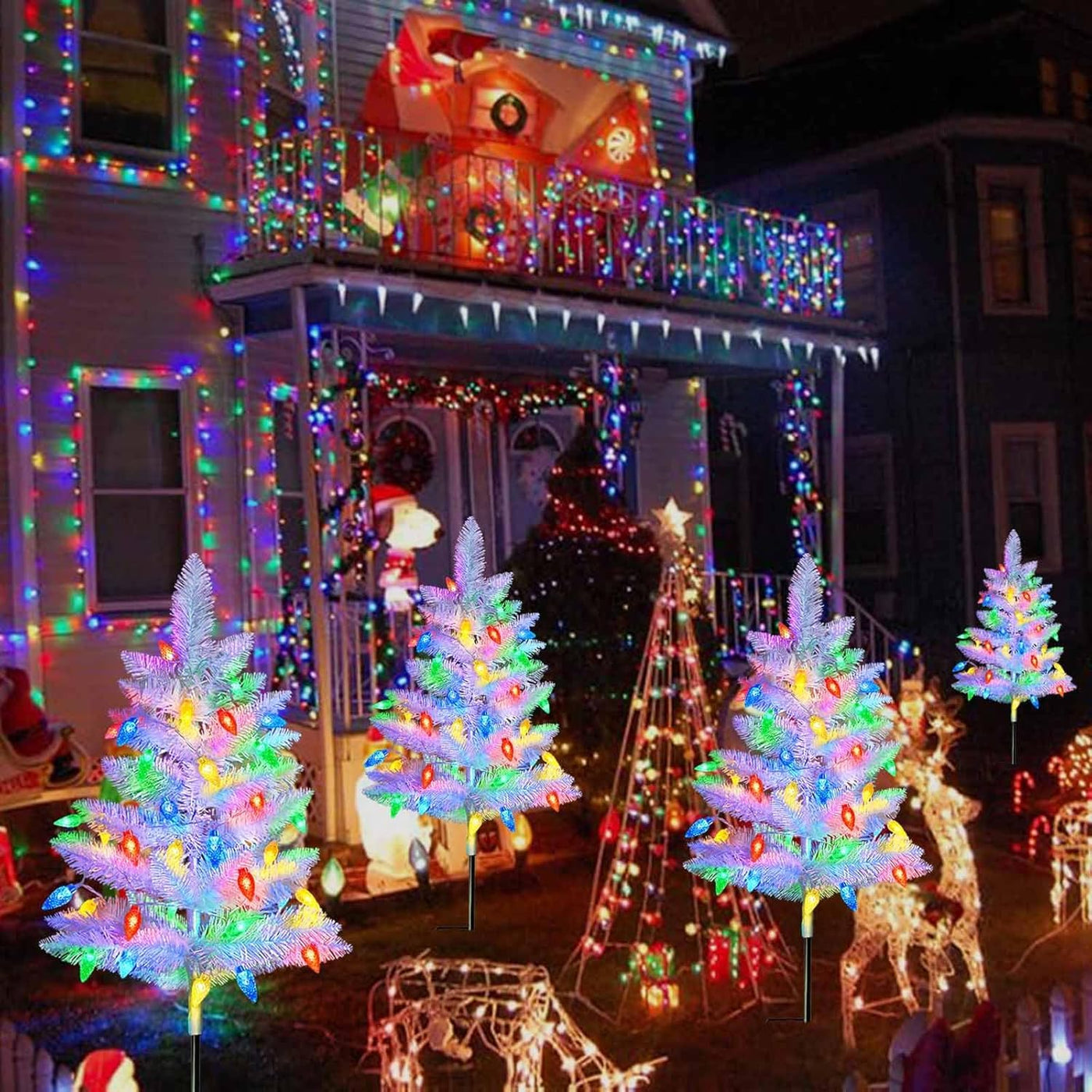 Q: What are the dimensions of the 2 Pack White Christmas Tree?A: Each small white Christmas tree stands 20 inches tall and has a width of 20 inches, making them perfect for outdoor decor in yards, porches, and pathways.