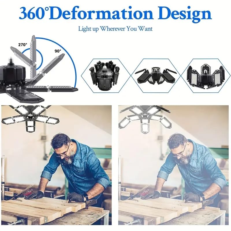 Adjustable Design: Unlike conventional lights that offer limited flexibility, our garage light boasts panels that can be stretched and folded twice, allowing for multi-angle adjustments ranging from 120 degrees to 240 degrees. This unique design effectively eliminates shadows, ensuring a well-lit work environment.
