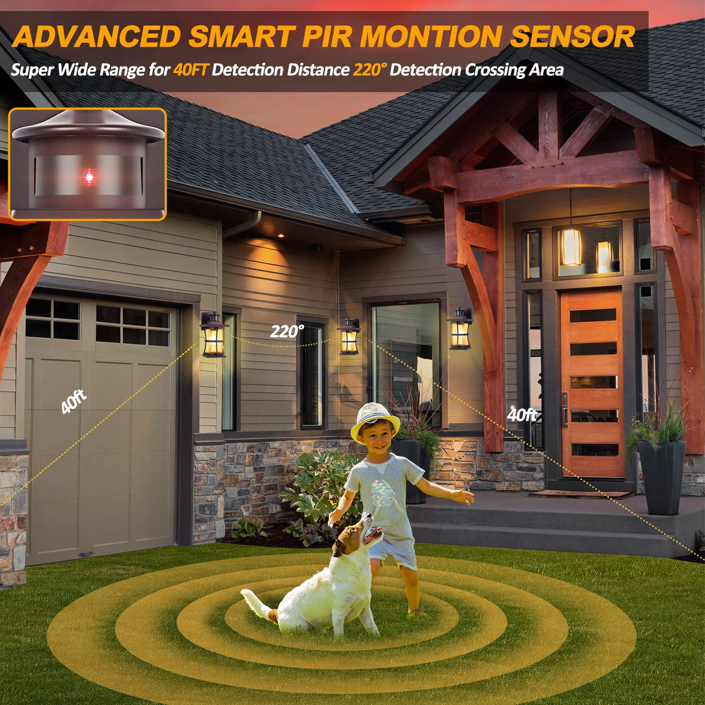 Q: How does the motion sensor work on these outdoor lights?A: The motion sensor detects movement within a range of up to 40 feet and a detection angle of 220 degrees. It automatically turns the light on to 100% brightness when motion is detected and can be set to different modes to save energy.