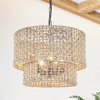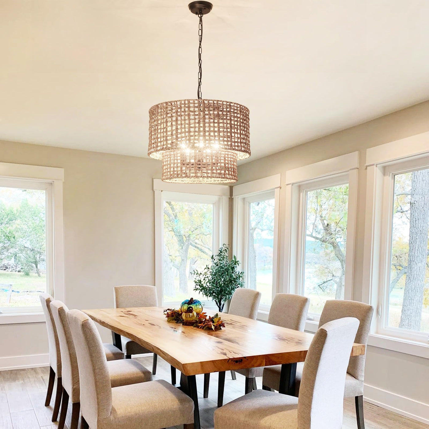 Transform your living space with this stunning two-tier rattan chandelier that perfectly blends farmhouse charm with coastal elegance. The hand-woven wicker design creates an intricate pattern that casts beautiful shadows when illuminated, adding depth and warmth to any room. This large pendant fixture features 5 lights arranged to provide ample illumination, while the natural-colored rattan drum shade adds rustic texture and visual interest. The two-tier design creates a sophisticated silhouette that makes a statement in dining rooms, living areas, kitchen islands, or entryways. The antique white finish complements various decor styles from boho to coastal to modern farmhouse. When lit, the woven pattern creates a mesmerizing interplay of light and shadow, establishing an inviting atmosphere in your space. This versatile lighting fixture works beautifully as a dining room centerpiece, foyer welcome light, or statement piece above a kitchen island. The black chain mounting system allows for adjustable hanging height to suit your specific space requirements.