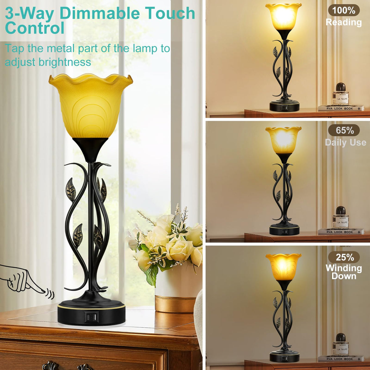 20'' Table Lamps For Living Room - Set Of 2 Touch Bedside Lamps With Usb C Ports, Leafy Vines Amber Flower Shade, Torchiere Desi