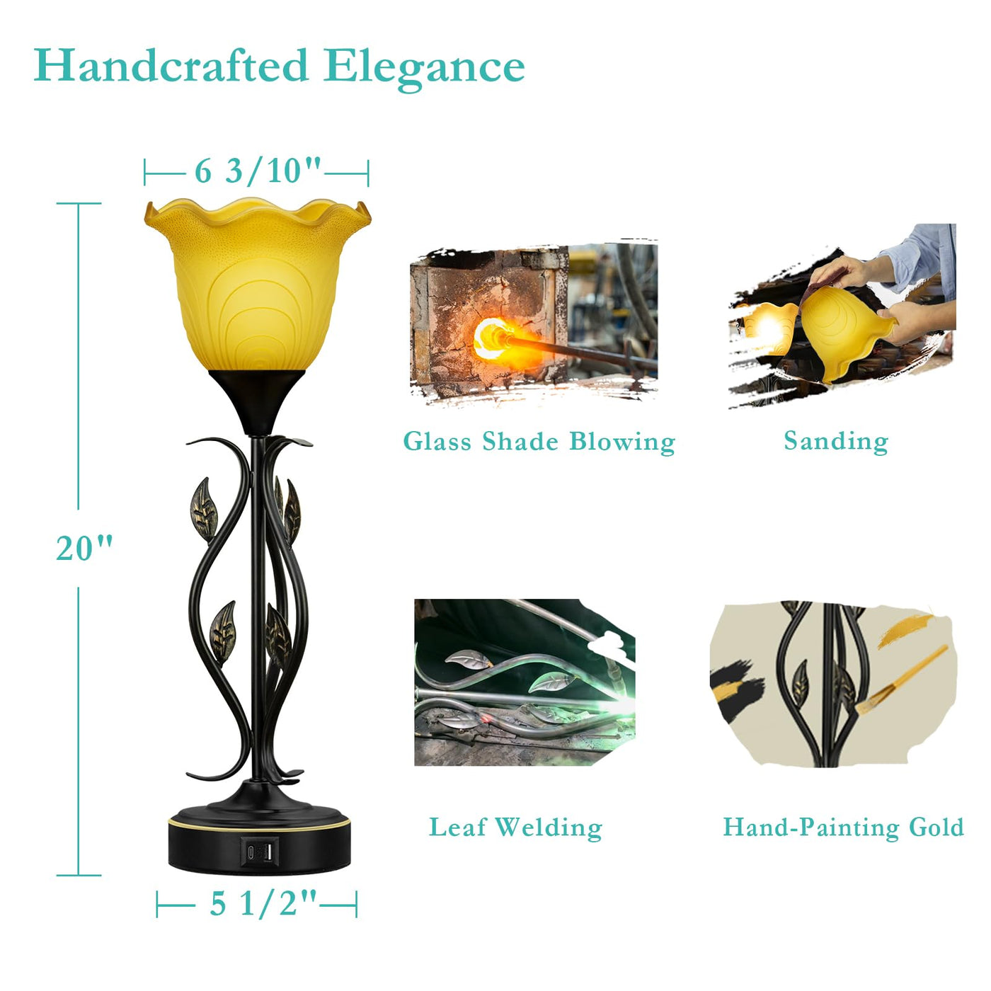 Perfect for Any Room - Practical & Stylish The blend of beauty and utility makes this set of 2 touch lamps a versatile addition to any space. Whether you're reading in bed, working from your desk, or simply relaxing on the couch, these lamps provide warm, adjustable lighting while keeping your devices charged and your space organized. Adjustable Brightness of lamps for living room end tables at Your Fingertips Easily adapt your lighting to suit any activity or mood with the intuitive 3-way touch control Low Brightness: Perfect for quiet evenings or a gentle glow while you sleep. Medium Brightness: Create a welcoming atmosphere for reading or entertaining guests. High Brightness: Illuminate your space for detailed tasks like studying or crafting. The touch-sensitive design of touch lamps for bedrooms set of 2 eliminates the need for switches, offering effortless convenience at any time of day or night. Why Choose These Lamps? - Key Features Perfect Size: 20 inches tall, ideal for nightstands and side tables. Elegant Design: Artistic vine-and-leaf base with gold-brushed accents and wavy glass shades. Touch Control: Three brightness levels (Low, Medium, High) for every activity. Convenient USB Ports: Dual USB-A and USB-C ports for fast, simultaneous charging. Eco-Friendly: Made with recycled materials and includes energy-saving LED bulbs. Upgrade your home with these bedroom lamps for nightstand set of 2-a perfect fusion of style, practicality, and sustainability.