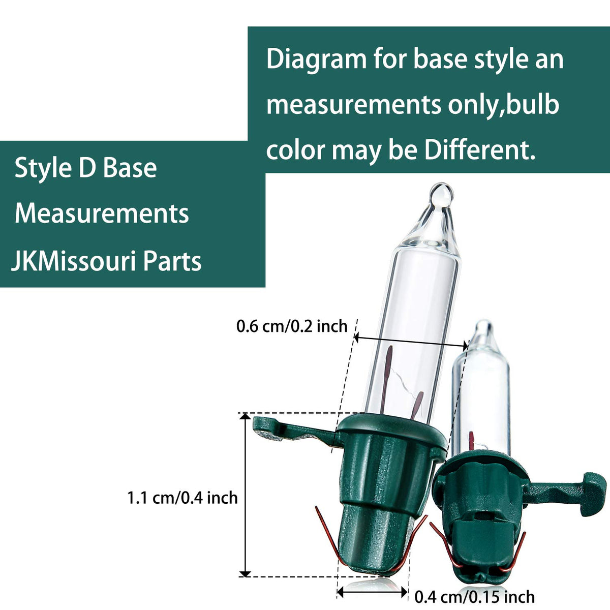 Q: What are the specifications of the 200 Count Christmas Mini Incandescent Wire String Lights?A: The 200 Count Christmas Mini Incandescent Wire String Lights feature bulbs that are 2.5 volts, 0.425 watts, and 0.17 ampere. The base height is 1.1 cm (0.4 inch) with a base diameter of 0.4 cm (0.15 inch), and the bulb diameter is 0.6 cm (0.2 inch). The bulbs come with a green base and emit a warm white glow.