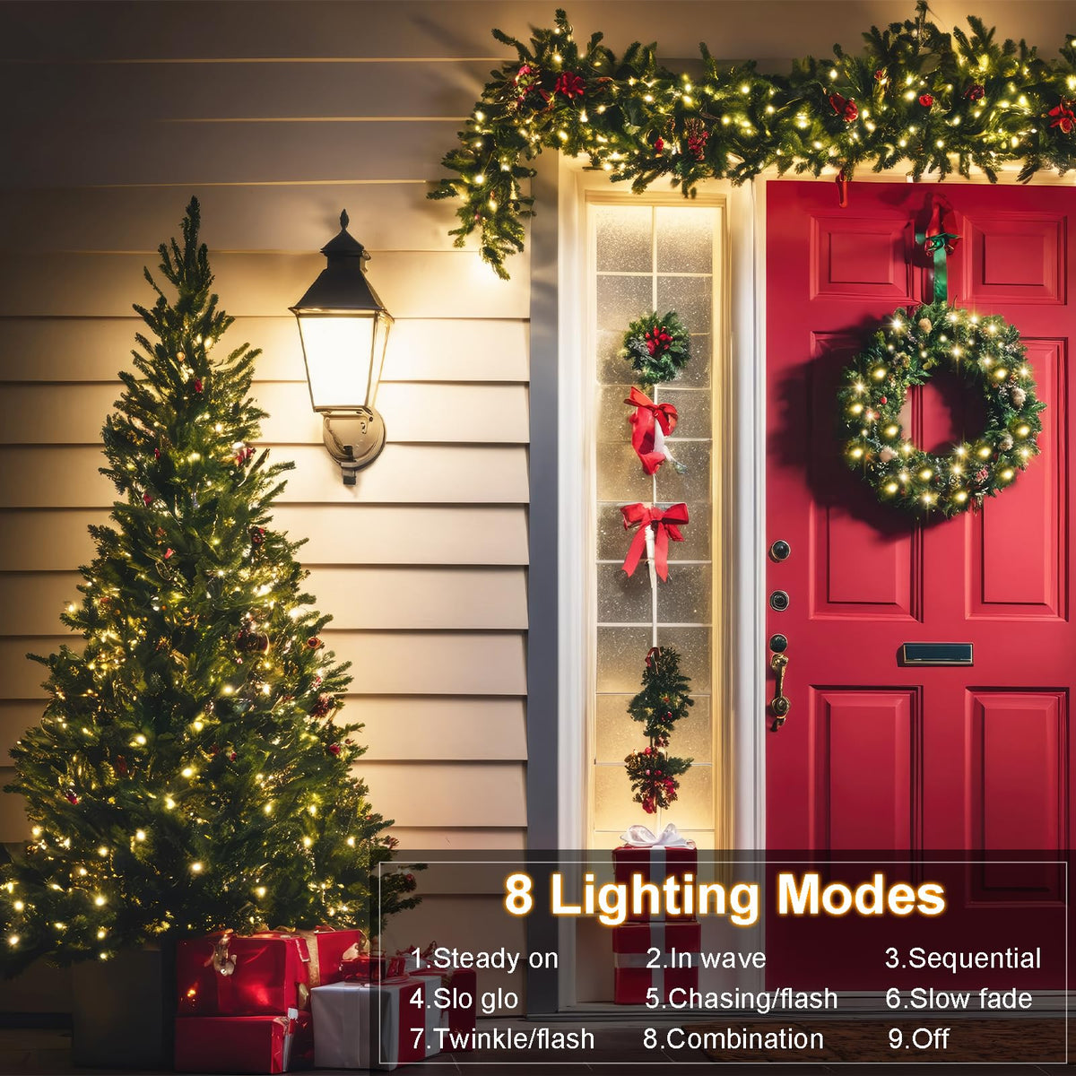 Q: What types of lighting modes are available with these string lights?A: The string lights feature 8 different lighting modes, including combination, steady on, slow fade, in wave, slo glo, chasing/flash, sequential, and twinkle/flash, allowing you to create the desired ambiance for any occasion.
