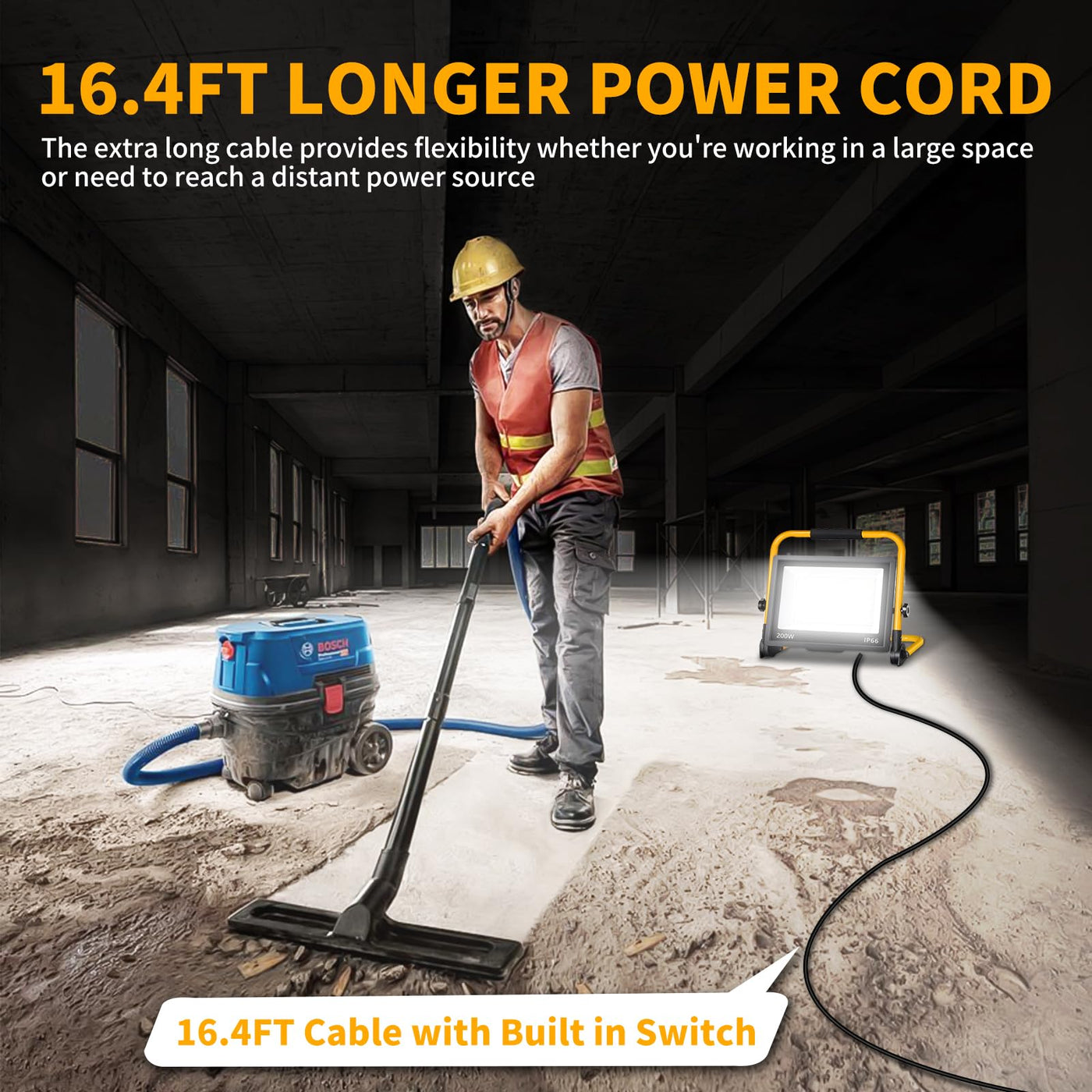 Q: What is the length of the power cord and does it have a switch?A: The work light comes with a 16.4 ft (5 meters) long power cord that includes a built-in switch, allowing easy on/off control without the need to unplug the unit.