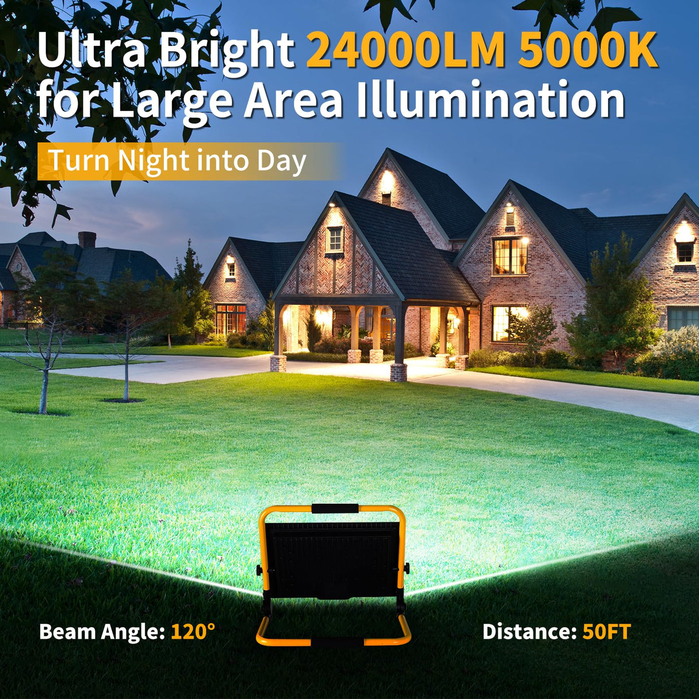Q: What is the brightness level of the 24000LM LED work light?A: The 24000LM LED work light features 266 premium LEDs that produce an impressive 24000 lumens of 5000K daylight white light, making it ideal for illuminating large areas with a wide 120° beam angle.