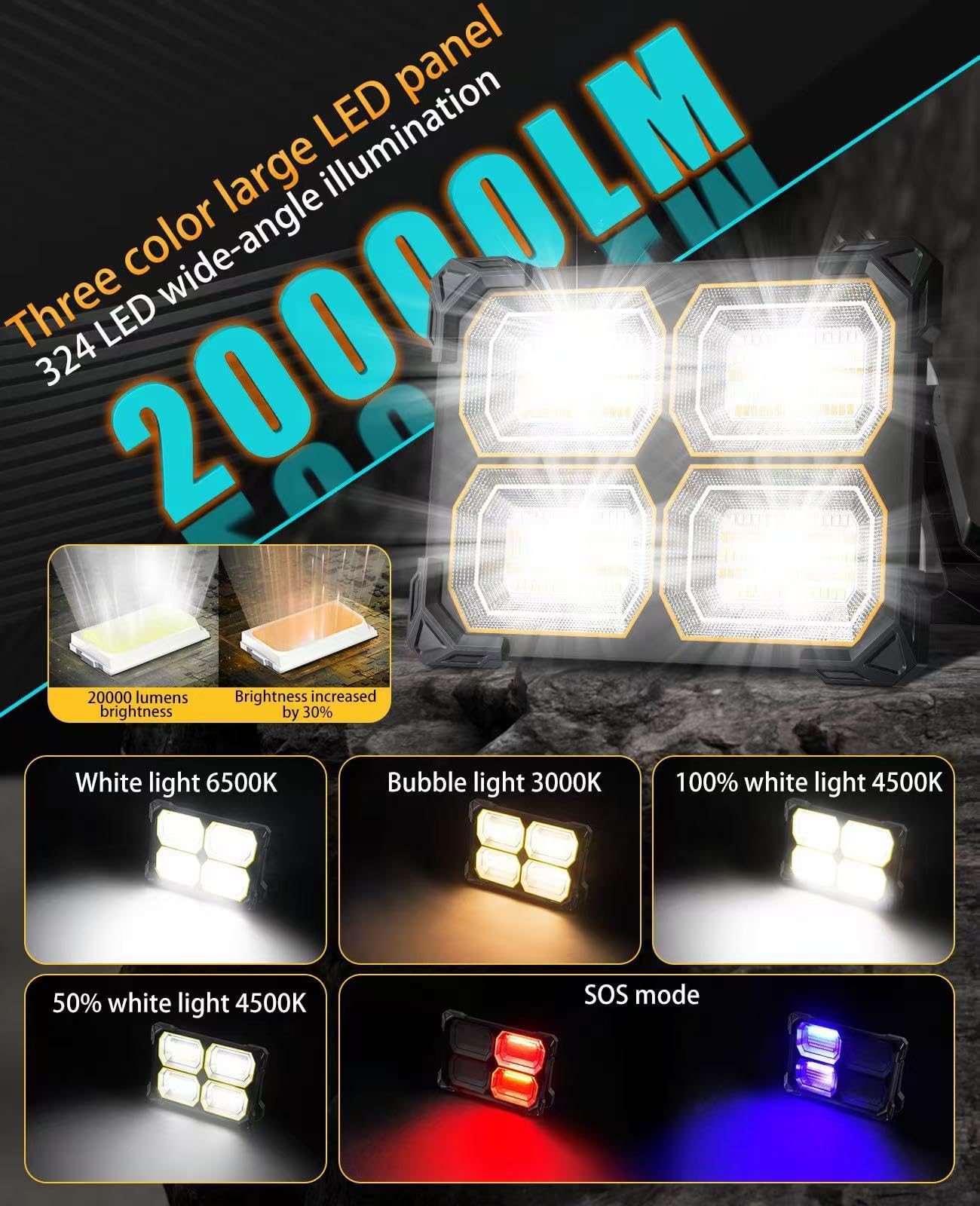 Q: What makes this work light ideal for outdoor activities?A: The 200W Rechargeable Work Light is highly portable and versatile, featuring a 180° adjustable bracket, built-in hook, and powerful magnets, making it perfect for outdoor camping, fishing, and emergency situations.