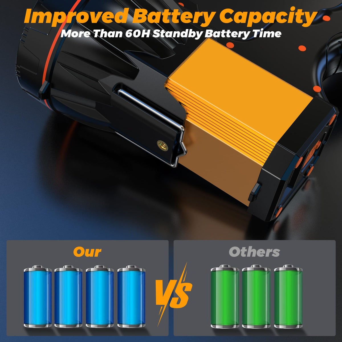 Extended Battery Life: Featuring a powerful 12,000 mAh battery, this rechargeable spotlight lasts up to 10 hours on high mode and offers an impressive 60 hours standby time. Energy-saving mode helps prolong usage while protecting your eyes.