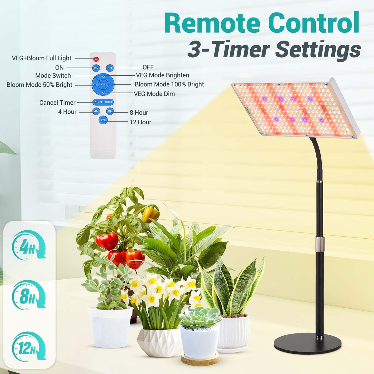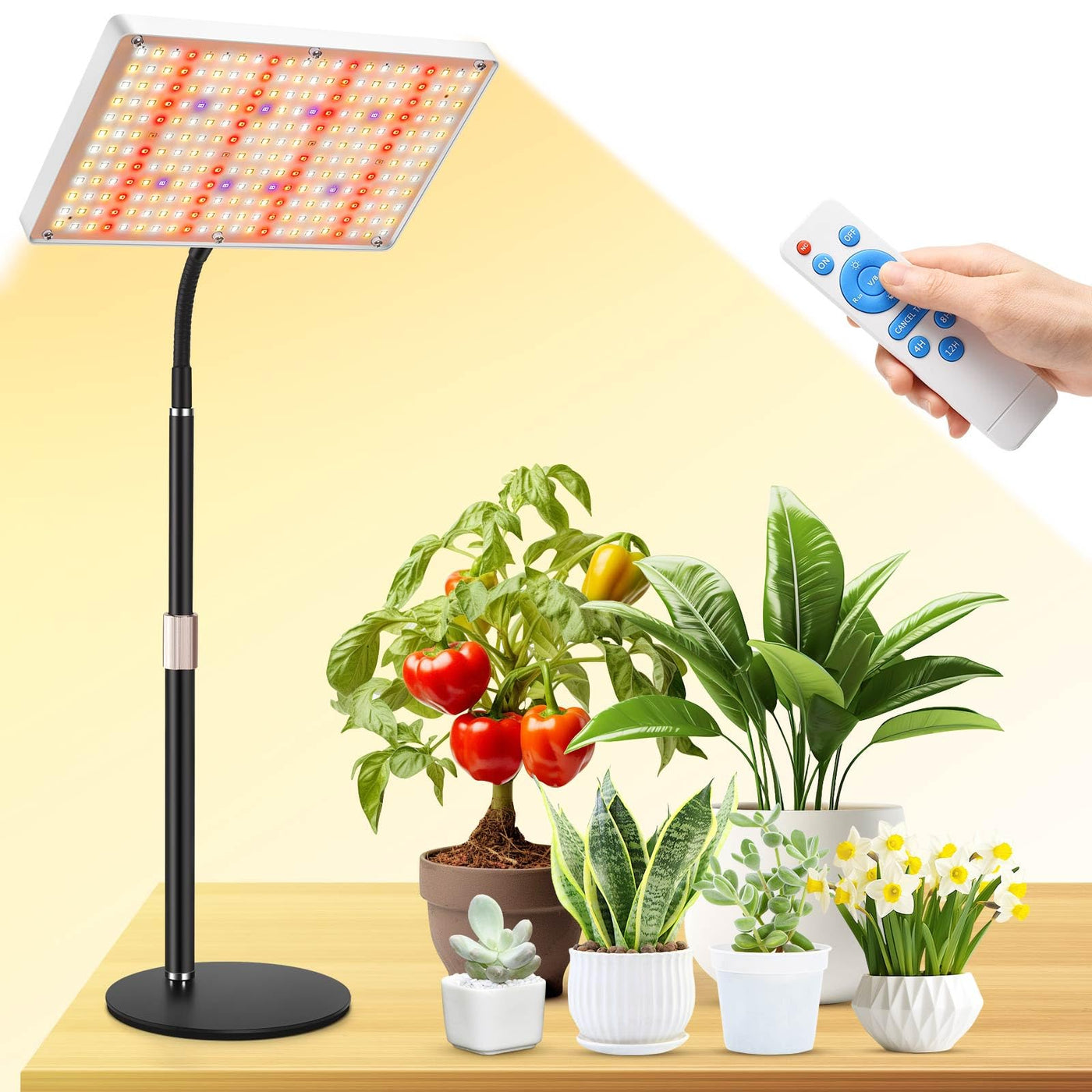 Professional Full-Spectrum LED Grow Light with Remote Control - Optimized for Indoor Plants Upgrade Your Indoor Garden: Give your plants the perfect light for every growth stage! Our advanced LED grow light combines 5 specialized light chips (Red, IR, UV, 3000K Warm White, and 6000K Daylight) to deliver a true full-spectrum glow, proven to boost photosynthesis from seedling to harvest. Key Features & Benefits: 3 Modes for Every Growth Phase: VEG Mode (UV, white light, warm white light): Ideal for seedlings and leafy greens. BLOOM Mode (Red light, IR): Enhances flowering and fruiting. VEG+BLOOM Mode (Full Spectrum-red light, IR, UV, white light, warm white light): Perfect for all-stage growth. 0%-100% Stepless Dimming Adjust brightness across 10 levels to match your plants needs-no harsh light stress! Remote Control with Timer Set it and forget it! Choose from 4H/8H/12H auto-off timers to save energy and mimic natural sunlight cycles. High-Efficiency & Long-Lasting The appropriate PPFD value for rapid growth Low Consumption with 50,000-hour lifespan Wide 120 Beam Angle for even coverage Universal & Durable Input: AC 100-277V (Works worldwide) -40C~70C Operating Range (For greenhouses or cold climates) Material: ABS (Heat-resistant) +SMD2835 LED chips Package Includes: 1 LED Grow Light (258 158 30.5 mm / 10.2 6.2 1.2 in) 1 Adjustable Telescopic Stand and base 1 360 Flexible Gooseneck 1 Remote Control 1 Power cable 1 User Manual Why Choose Us? ? Science-Backed Full Spectrum ? Easy Setup - Secure the base, twist on the pole, and adjust height in seconds. ?Perfect for: Herbs, succulents, orchids, hydroponics, and more! Note: For best results, position the light 12-24 above plants and adjust daily exposure based on species.