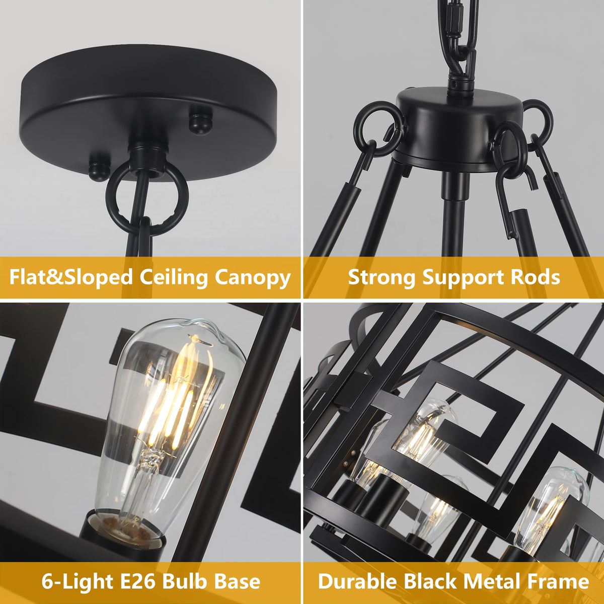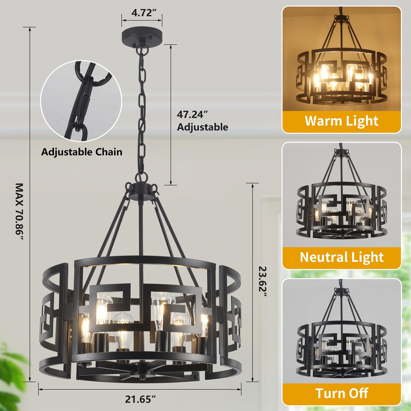 21.6'' Black Round Drum Chandeliers Dining Room Light Fixtures 6-Light Farmhouse Rustic Industrial Pendant Light Kitchen Island