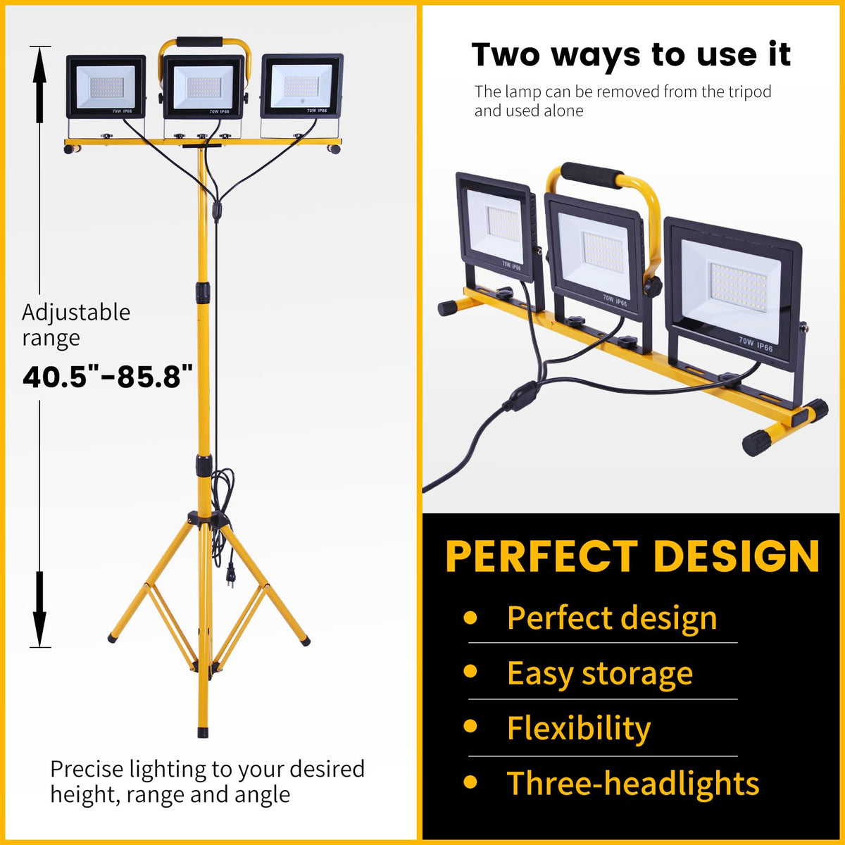 21000 Lumen Work Lights With Stand, 3 Adjustable Head Led Work Light, With Adjustable And Foldable Tripod Stand, Waterproof Lamp With Individual Switch With 6500 Kelvin Color Temperature