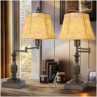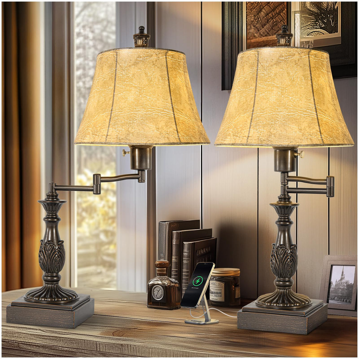 23.5'' Rustic Traditional 350 Adjustable Swing Arm Table Lamp Set Of 2 With Usb A+C Ports Brown Finish Faux Leather Shade Vintag