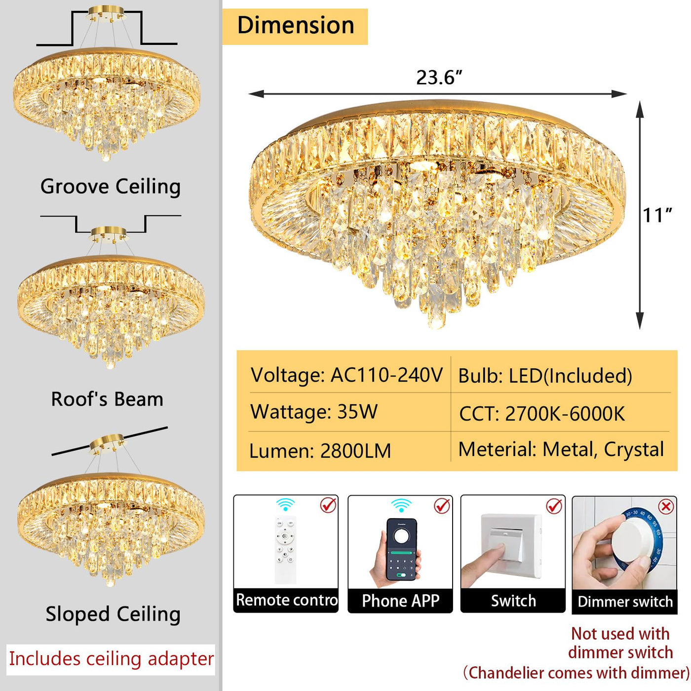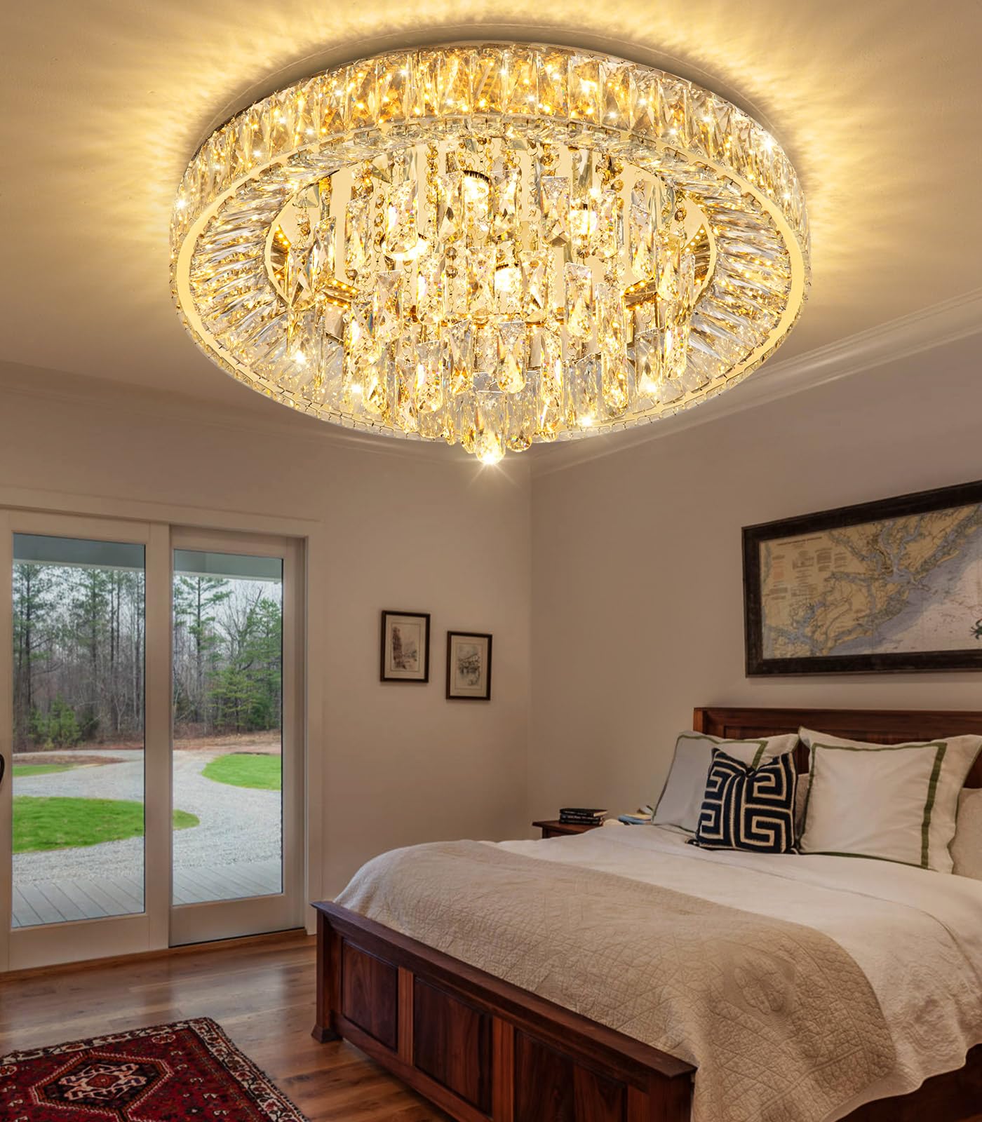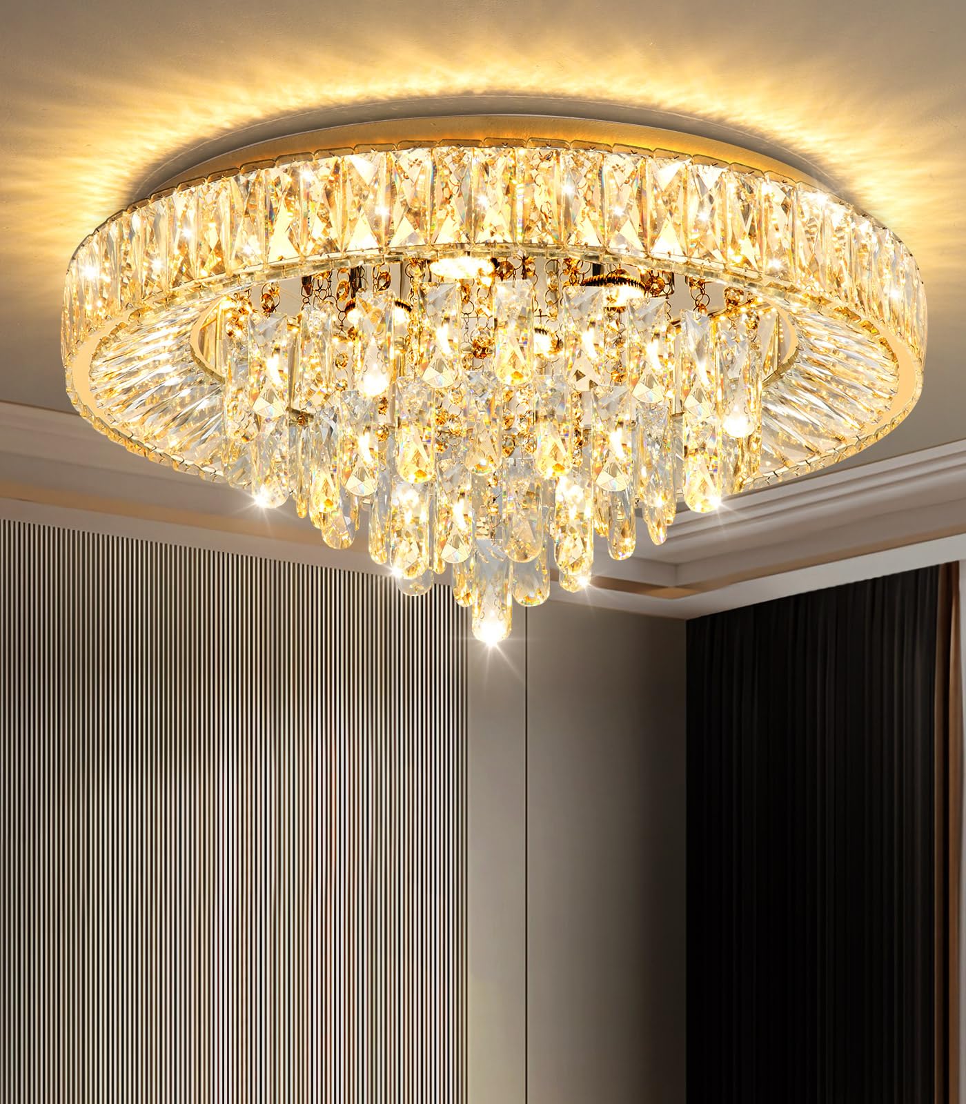 23.6'' Modern Crystal Chandeliers Led Dimmable Flush Mount Ceiling Chandeliers For Living Room Entrance Foyer Bedroom Gold