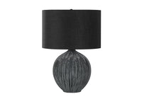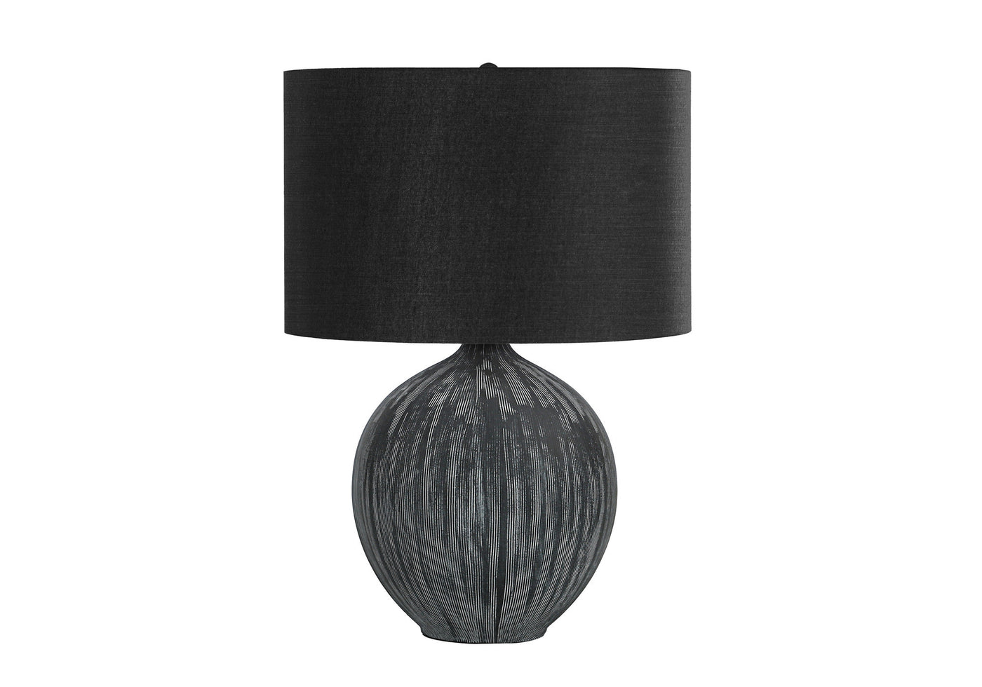 Add a bright anchor to your room with this 23-inch black ceramic round table lamp with black drum shade. A gorgeous black textured ceramic base brings just the right amount of pizzazz to this fabulous lamp. Includes a black linen, drum shaped shade, making this a fashionable piece that will complement most any interior. This standard table lamp is designed to provide general lighting to the area. The light that this lamp throws is soft and warm to elevate the look of most any space in your home. Bring some lite and good vibes into your space with this updated and stylishly designed lamp. 23-inch H x 16-inch W x 16-inch D