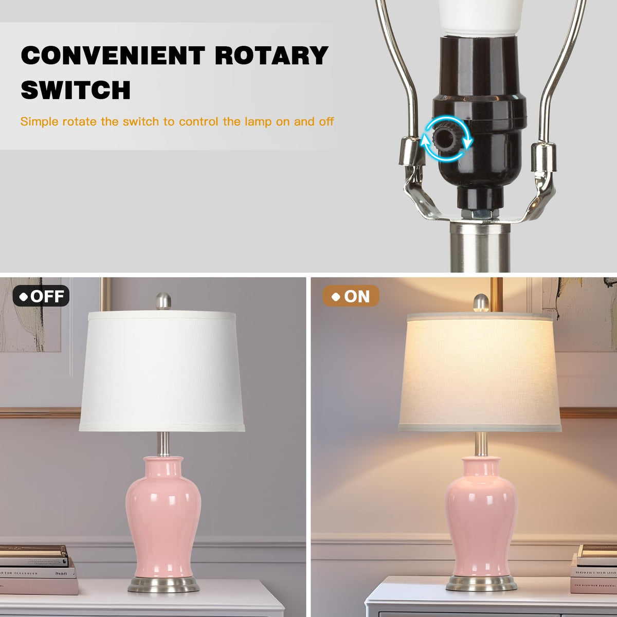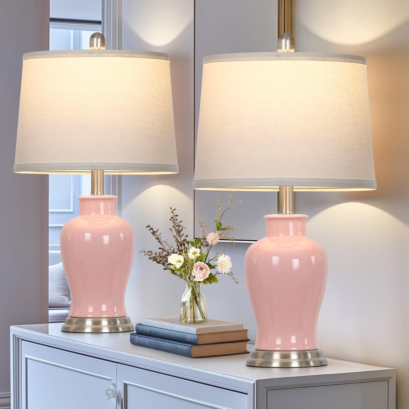Modern Ceramic Table Lamp Color: Pink And Silver Size: 23 *12.5 *9 Inches Material: High-Quality Ceramic 1.The Ruzectt Pink And Silver Lamp Features High-Quality Ceramics And A Silver Metal Base. The Perfect Fusion Of Classic And Modern, Can Add Artistic Atmosphere To Your Living Room And Bedroom. 2.The Size Of The Ginger Jar Lamp Is: 23*12.5*9 Inch. The Warm Light And Modern Style Design Make Great For Farmhouse, Living Rooms, Bedrooms, Offices, Study Etc. 3.The Lamp For Bedside Is Made Of High-Quality Ceramic With Smooth And Shiny Surface, Durable, Scratch-Resistant And Will Not Fade. 4. The Farmhouse Lamps With White Linen Lampshade Sfilters And Softens The Light And Provides A Warm Light, Bring Comfortable Atmosphere To Your Home. 5.The Lamp For Bedroom Include An E26 Base Led Bulb With 800 Lumens, And A Lifespan Of 25,000 Hours. It Saves Up To 90% On Energy Consumption, Providing A Comfortable And Natural Light, No Flicker, No Dazzle, Has An Effect On Preserve Eyesight.