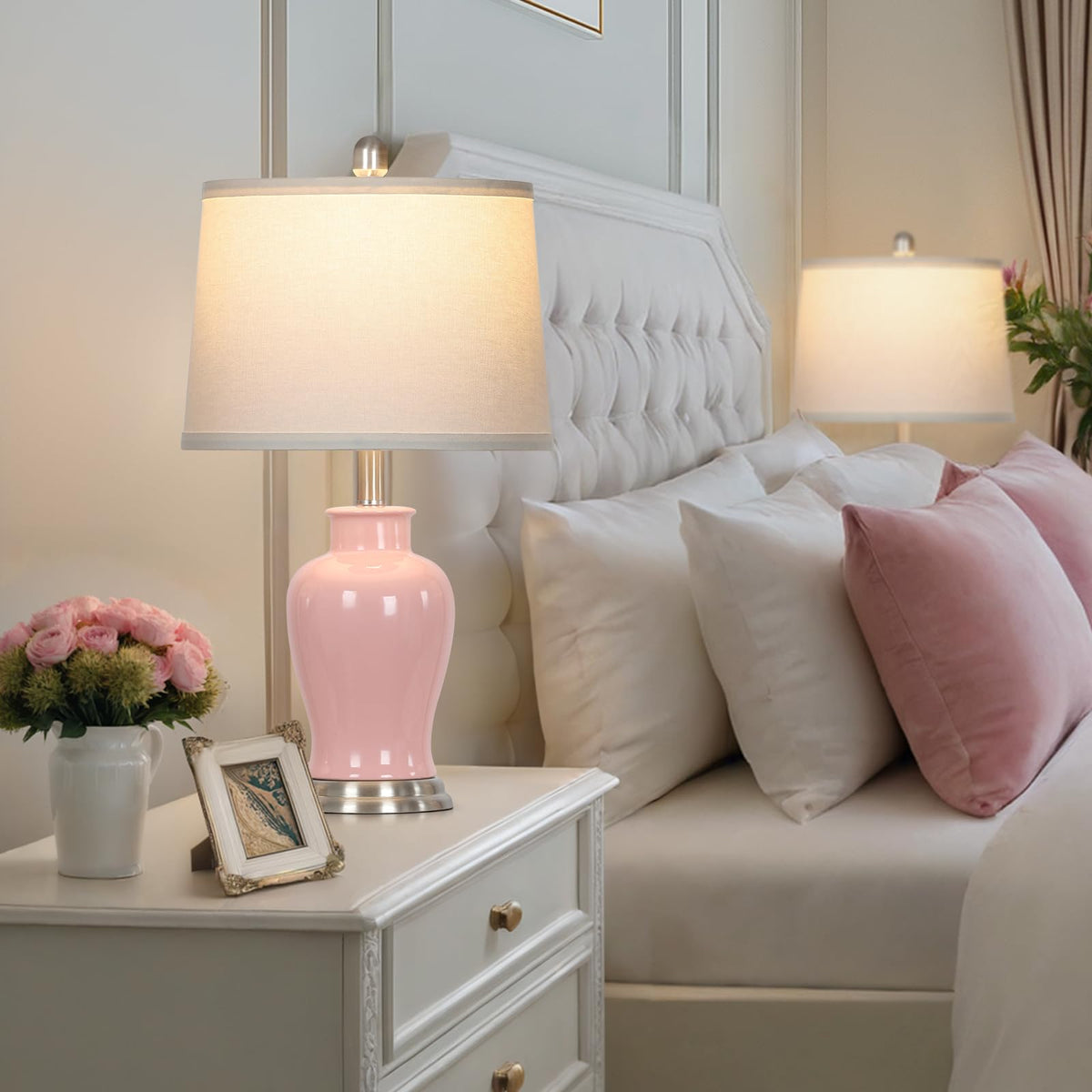 Q: Can these lamps be used in different rooms?A: Yes, the modern pink ceramic table lamps are versatile and ideal for use in various rooms including bedrooms, living rooms, offices, and studies, enhancing the decor with their elegant design.