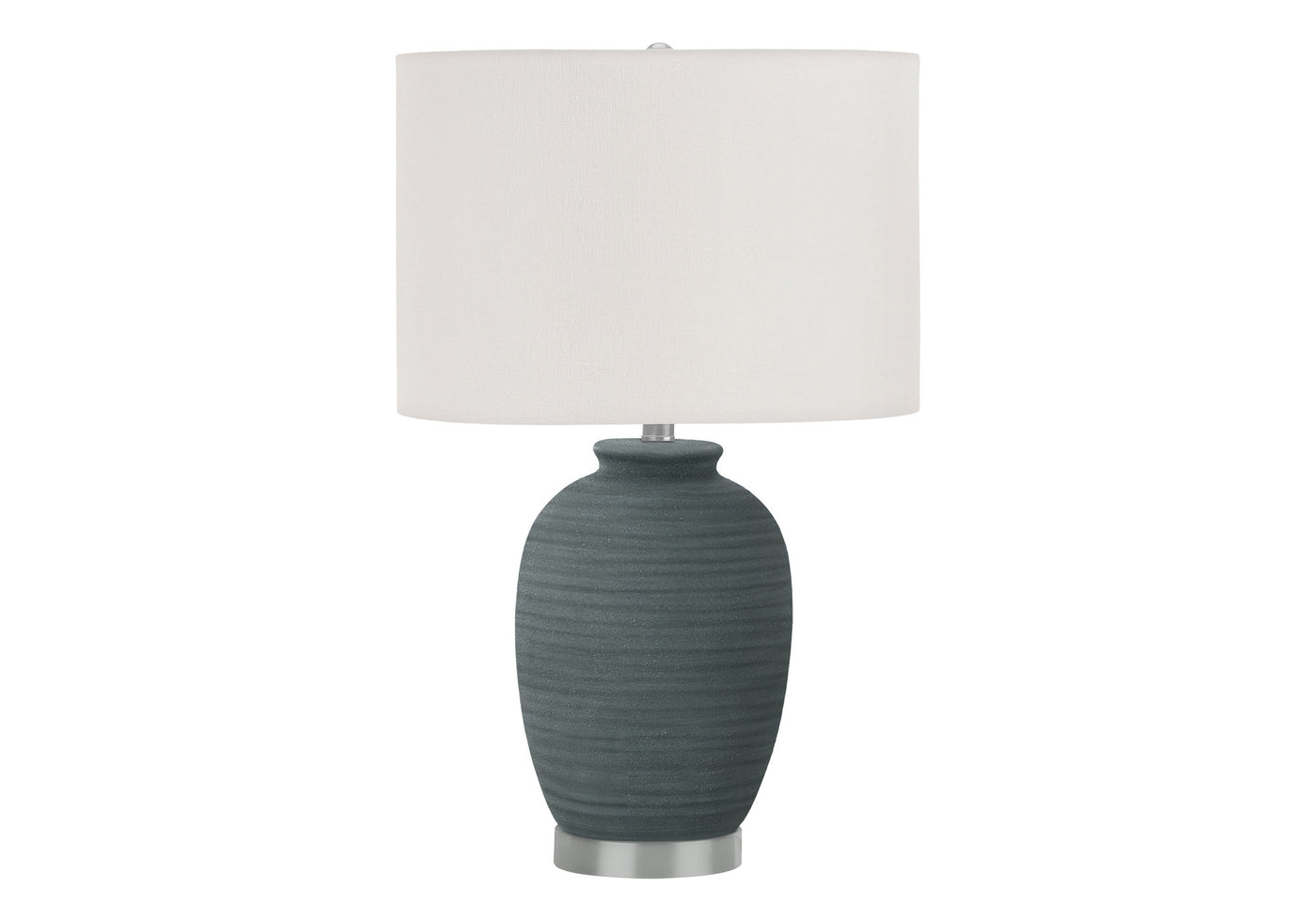 Embrace the good life with this hard working and stylish 24-inch blue and silver ceramic round table lamp with ivory drum shade. The base of this lamp is made of textured ceramic finished in a blue and silver tone. Includes a ivory linen, drum shaped shade, making this a fashionable piece that will complement most any interior. This standard table lamp is designed to provide general lighting to the area. High quality design makes this a great lamp for not only lighting, but accenting a room with style. Bring some lite and good vibes into your space with this updated and stylishly designed lamp. 24-inch H x 15-inch W x 15-inch D