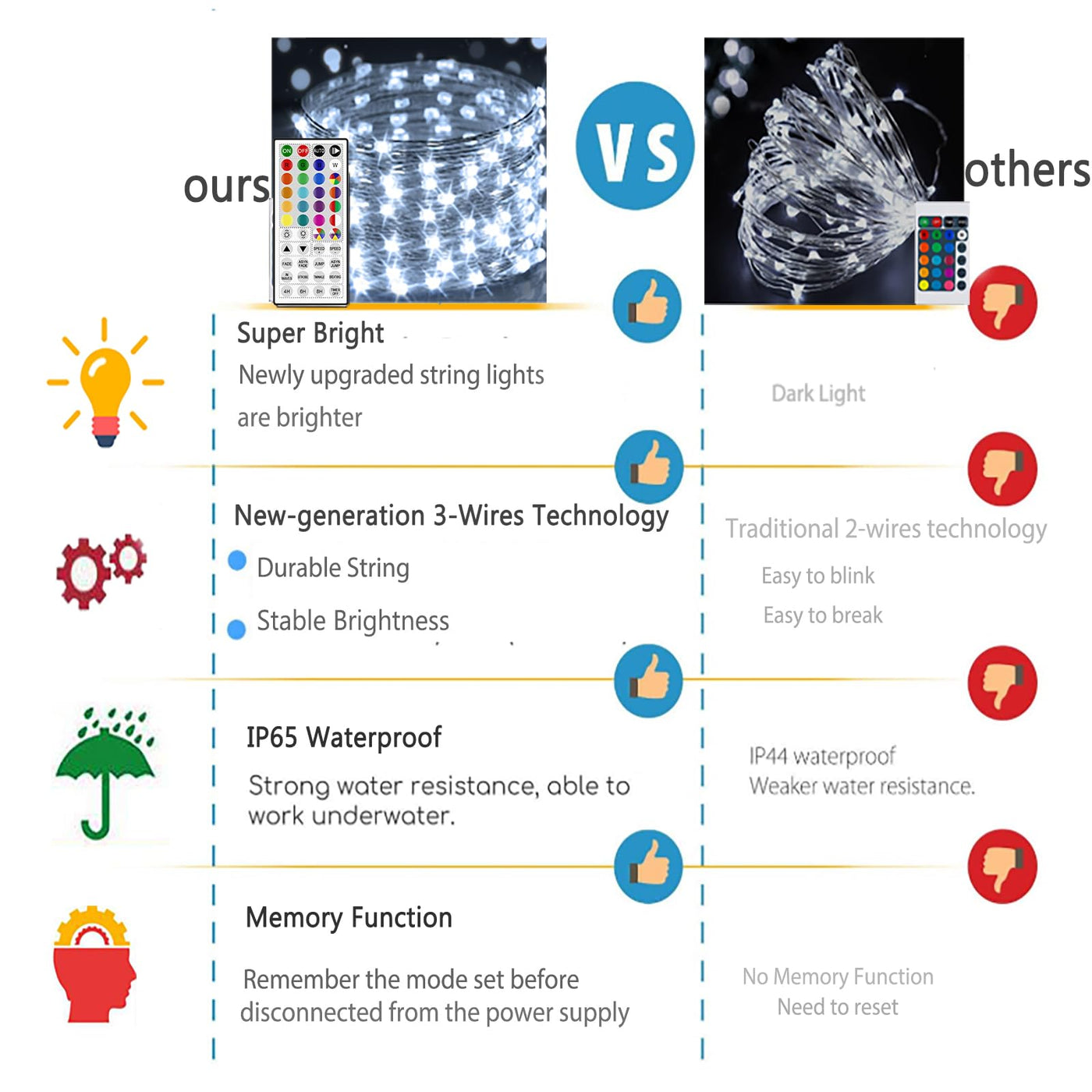 StarryEver Multi Color Changing Fairy Lights DIY Night Lights Use the cute string lights to decorate bedroom, home,add soothing and dreamy ambiance for sleep, party, wedding and more. Let you and your children enter the sleep with sweet warm light Product Specifications: Length: 10m/33ft (Not Connectable or Cut) LED Quantity:100 LEDs LEDs Spaced Every 3.9 Wire Material: Copper Wire(Sliver Color) Color Option: Total 16 Colors; Red, Green, Blue, Purple, Bluish White, Orange Power Supply: 5 volts USB Powered String Light Waterproof Grade: IP65 Working Temperature: -30-60? Timer Function Buttons on Remote: *Timing Function 6H: 6 hours on and 18 hours off per day; Press the TIME again or unplug to cancel the timer. Package Include: 1 33ft 100 LEDs String Lights 1 Remote Control(1 CR2025 battery included) 1 Power Apapter 1 User Manual