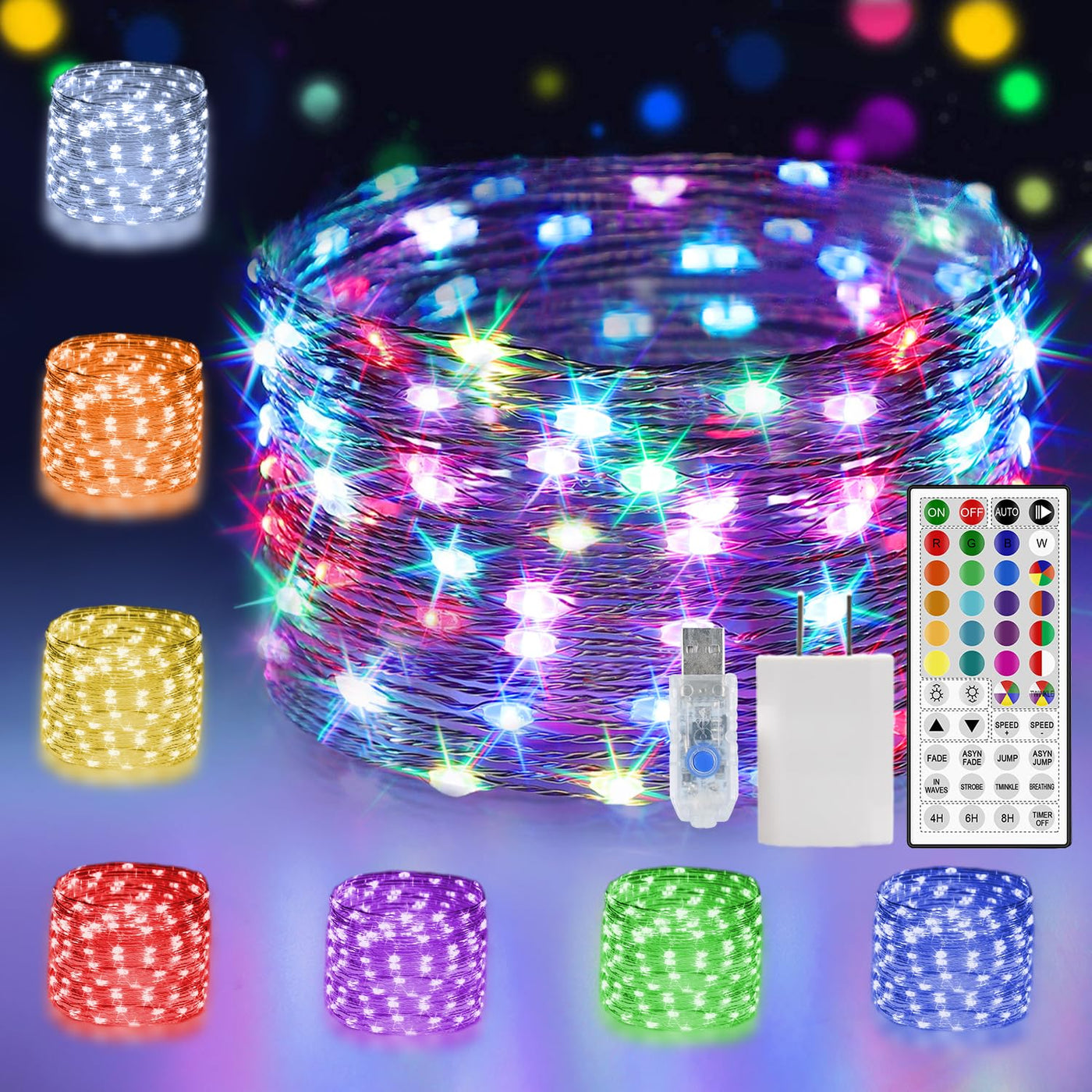 24 Colors Changing Fairy String Lights USB Powered with Remote Control, 33ft 100 RGB LED Bright Silver Wire Firefly Lights for C
