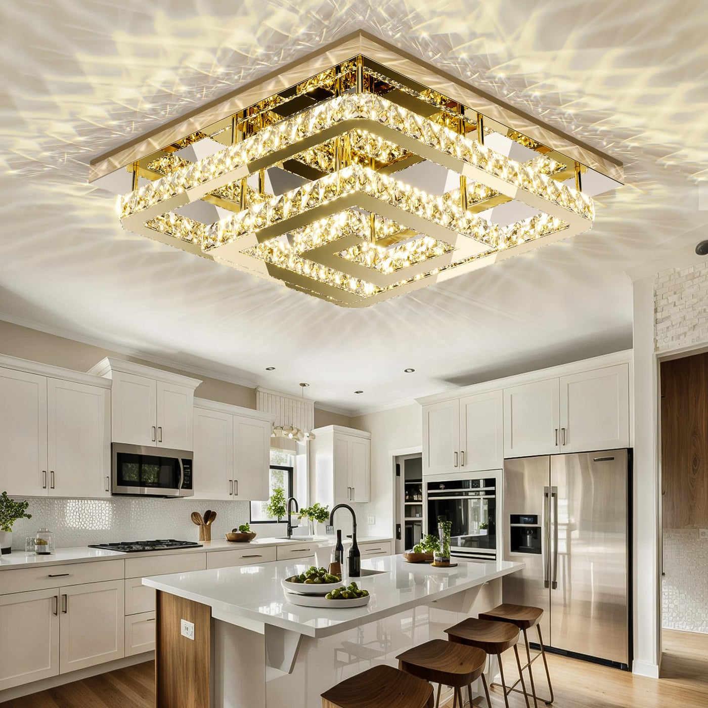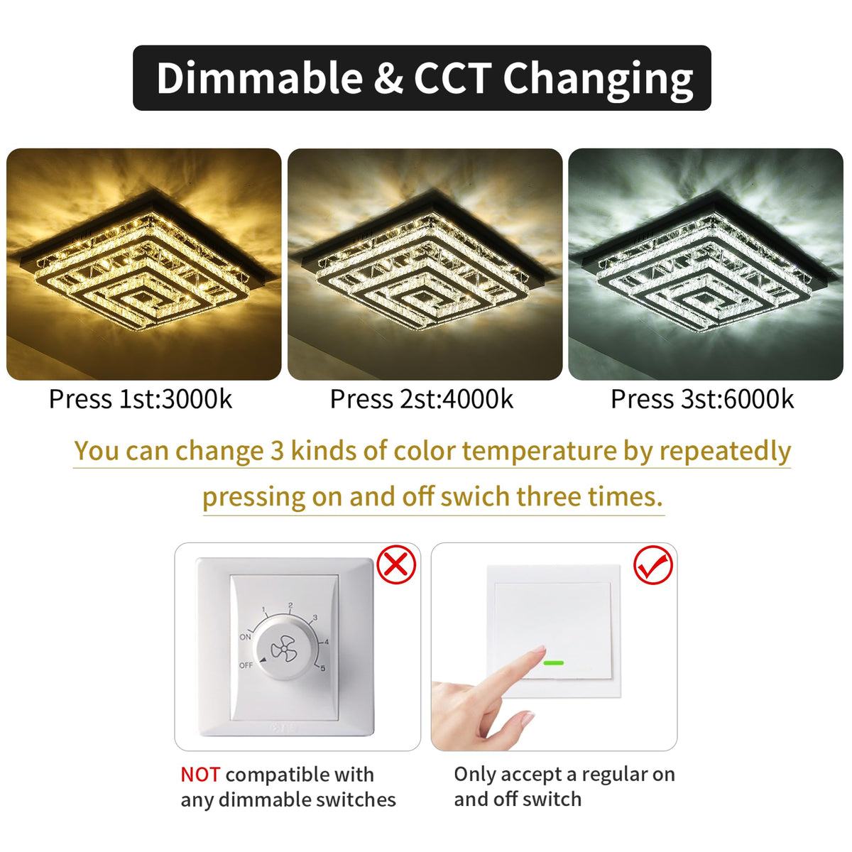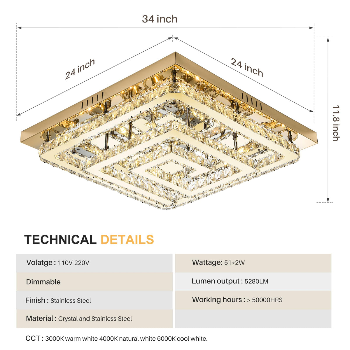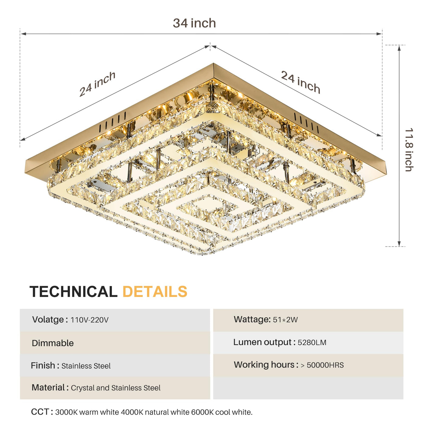 Sophisticated Crystal Flush Mount Light - Elevate Your Home with Style and Function Bring a touch of modern elegance to your home with our 24'' x 10''H Crystal Flush Mount Light. Featuring a stunning two-layer LED design, each layer delivers a powerful 45W output, providing bright, even lighting while maintaining a sleek, low-profile look. The polished 24'' x 1.57''H canopy and 10'' lamp height create a perfect balance of contemporary style and timeless sophistication. Tailored Lighting for Every Occasion Set the mood in any room with just a flip of a switch! Choose from three customizable color temperatures-3000K warm white for a relaxing ambiance, 4000K natural white for everyday clarity, and 6000K cool white for a vibrant, energizing feel. The included remote control lets you adjust both brightness and color temperature, so you can create the perfect atmosphere to match your decor or mood. Durable, Energy-Saving Design Built to impress and endure, this fixture combines premium K9 crystals with rust-resistant stainless steel for a luxurious yet durable finish. The energy-efficient LED technology not only reduces your energy bills but also ensures long-lasting performance with minimal maintenance. Perfect for Any Room From the living room to the bedroom, kitchen, or even the balcony, this versatile crystal light fixture enhances any space with its modern, luxurious appeal. Its adaptable design fits seamlessly into hallways, dining rooms, walk-in closets, and more, making it a stylish addition to any home. Easy Setup, Exceptional Support Installation is simple and stress-free! All components are clearly labeled, and the step-by-step guide makes it easy to assemble and mount. If you need assistance, our friendly customer support team is available 24/7 to help you every step of the way. Upgrade your home with this exquisite crystal flush mount light-where cutting-edge design meets everyday practicality, and every detail shines with perfection.