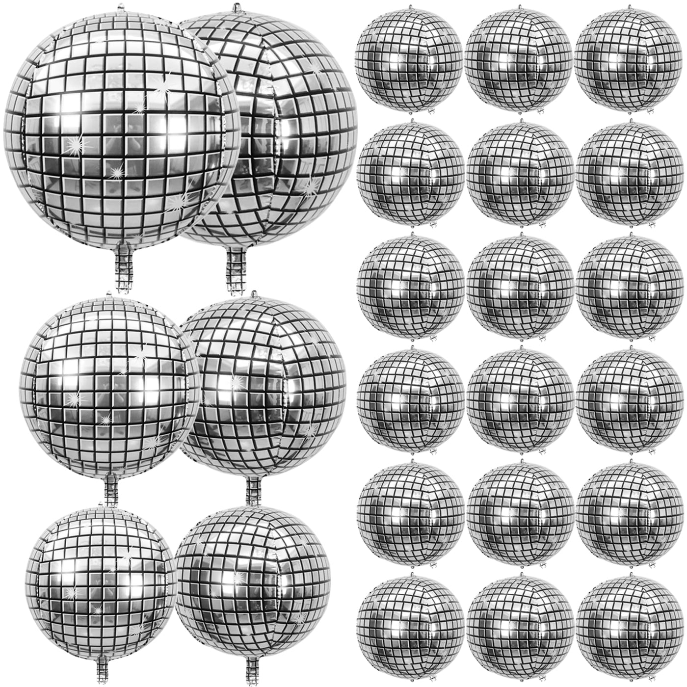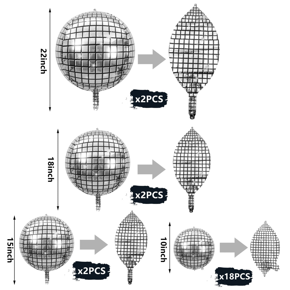 24 PCS Disco Ball Balloons Different Sizes- 4D Large Disco Balloons 10 Inch 15 Inch 18 Inch 22 Inch Assorted Round Metallic Silv