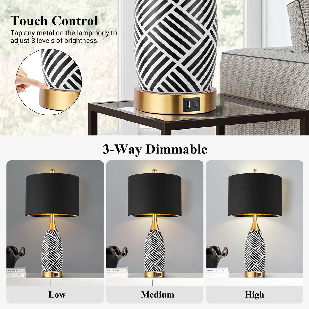 WIHTU 25.5 Black and Gold Touch Control Table Lamp, 3-Way Dimmable Ceramic with USB & Type-C Ports, Ideal for Bedroom & Office