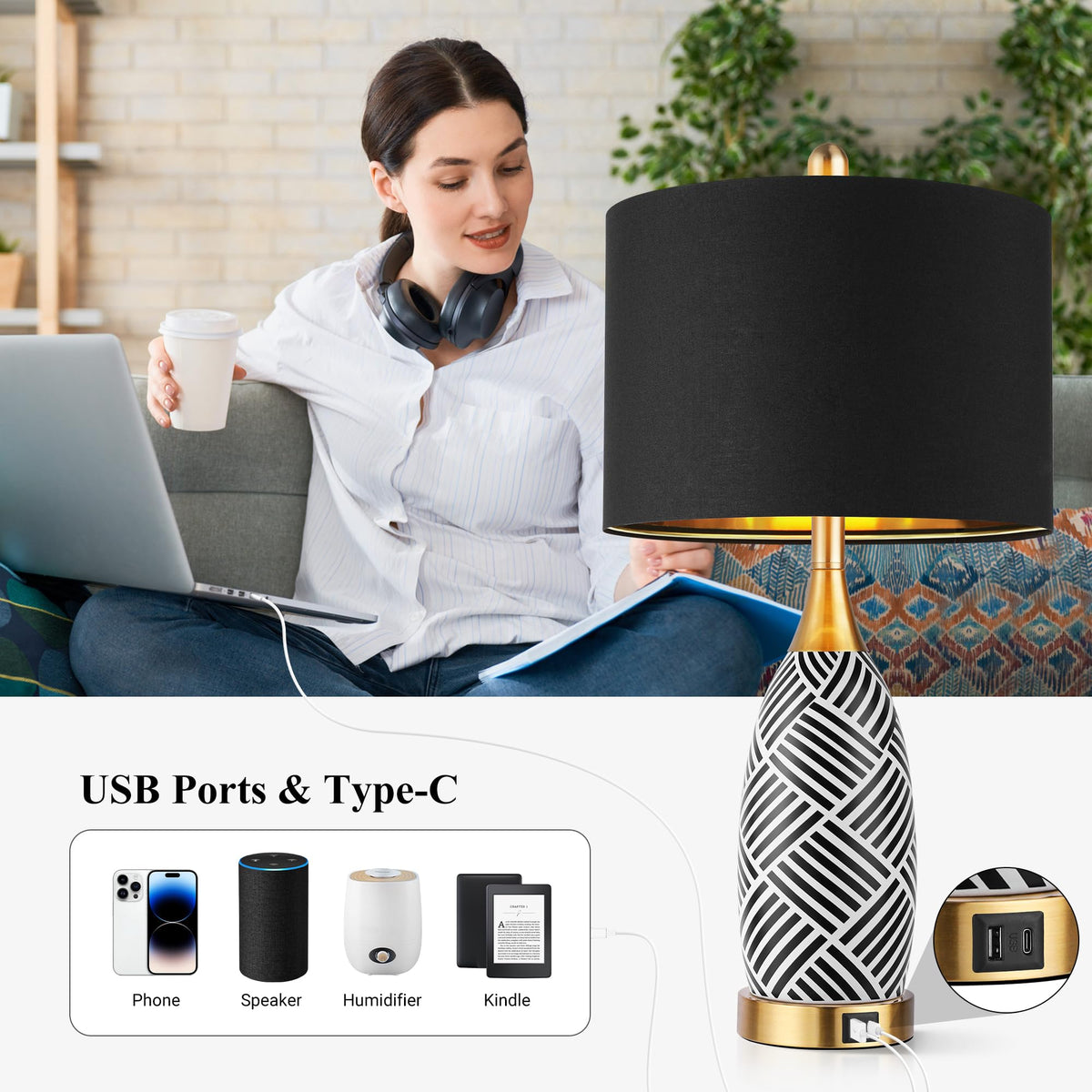 Q: Can I use the USB and Type-C ports to charge my devices while the lamp is off?A: Yes, the USB and Type-C ports will function as long as the lamp is plugged into a power source, allowing you to charge your devices whether the lamp is on or off.