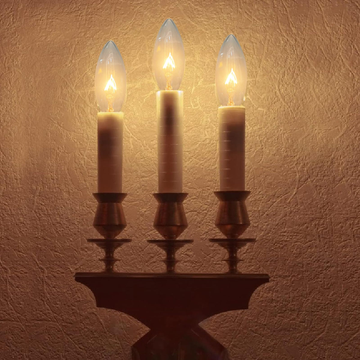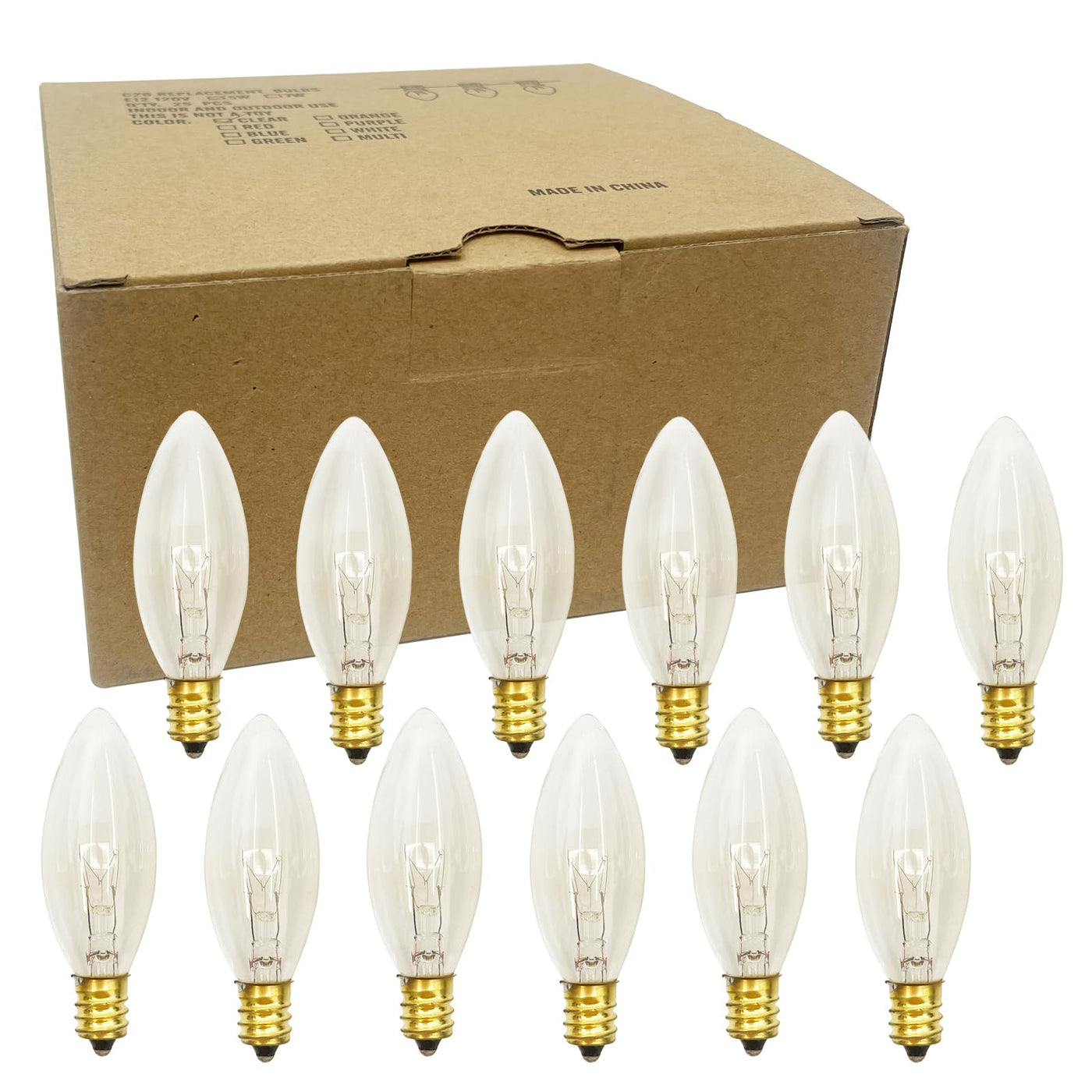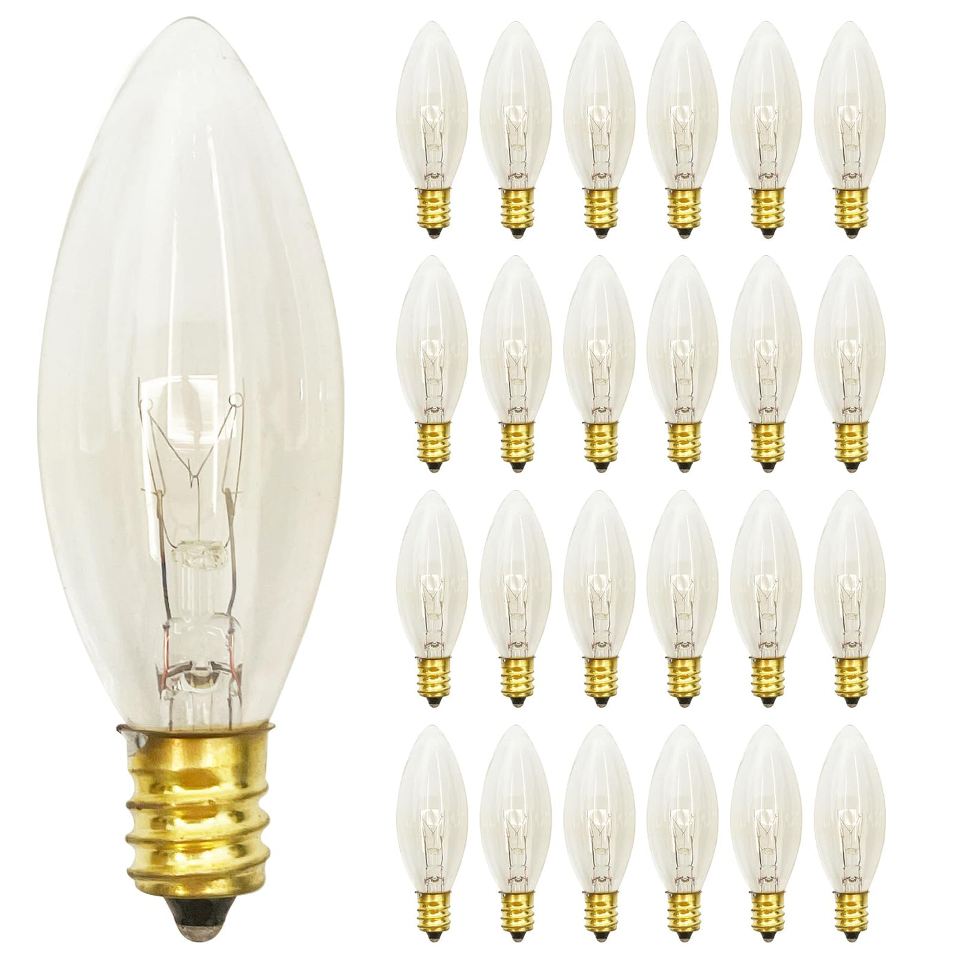 25 Pack C26 Christmas Replacement Light Bulbs, E12 Candelabra Base Bulbs, Clear Torpedo Tip Replacement Lights Bulbs for Indoor Outdoor Electric Window Candle, Chandeliers, C7/E12 Candelabra Base, 7 Watt Night Light Bulbs Specifications: C26 Clear Replacement Lights Bulbs Power Consumption: 7 watt Bulb Dimension: 3 inch Voltage: 120V Material: Glass Color: Clear Light Bulb Bulbs Quantity: 25 pcs Socket Base Type: E12/ C7 Base Bulb Life Span: 1500 Hours Special Features: IP44 Water Resistant All bulbs are tested over 48 hours before packing. If you have any quality problems, please contact us directly!