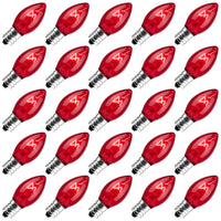 Q: What are the specifications of the 25 Pack Replacement C7 Light Bulbs?A: The 25 Pack Replacement C7 Light Bulbs feature a 5 watt power output and an E12 base, making them compatible with standard C7 Christmas string lights. Each bulb has a lifespan of approximately 3,000 hours.