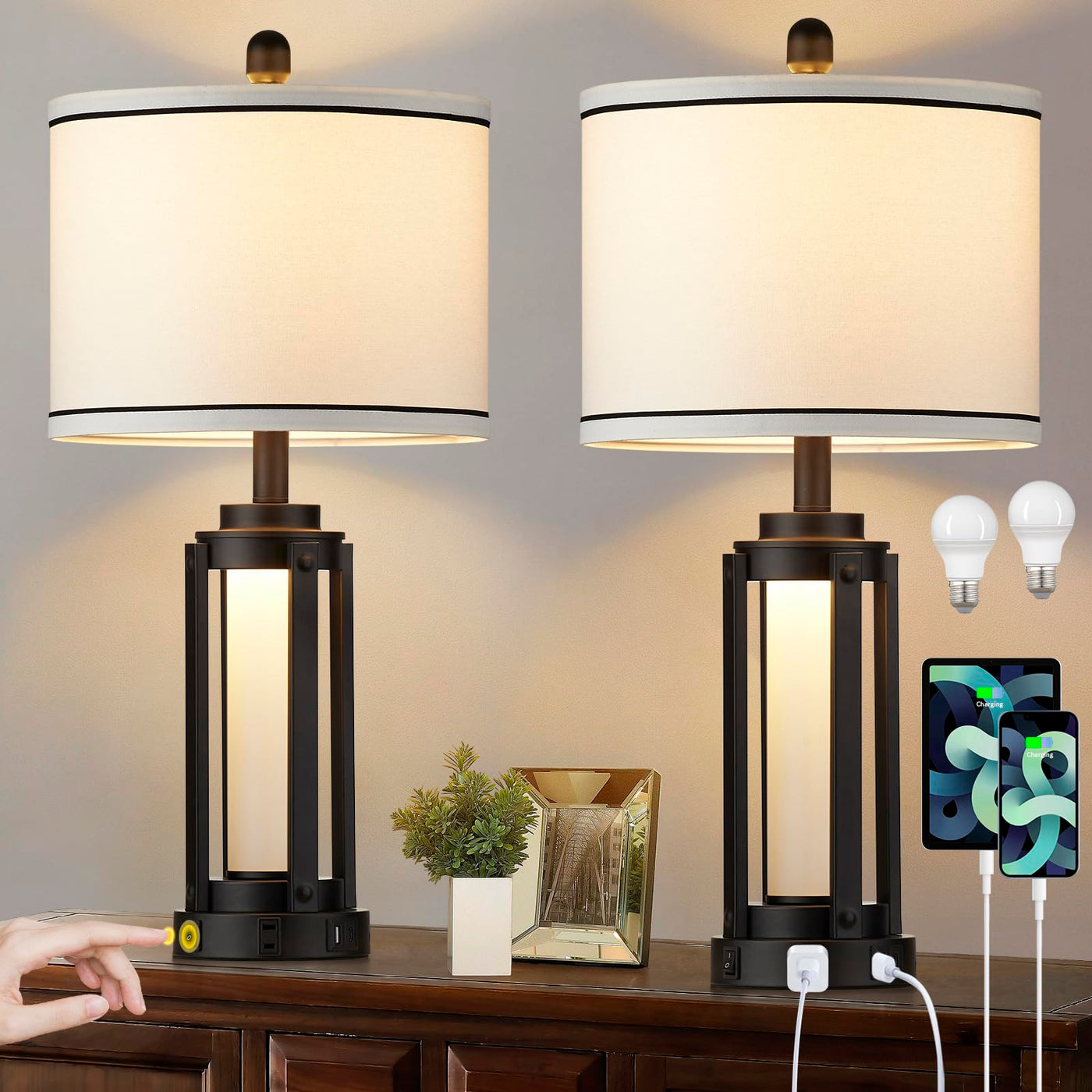 25" Modern Table Lamps Set Of 2, Industrial Beside Lamps With Usb A+C Charging Ports & Ac Outlet, Nightstand Lamp With Glass Night Light For Living Room Bedroom End Table Decor White(4 Bulbs Included)
