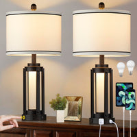 Q: What is the design style of the lamps, and where can they be used?A: These lamps showcase an industrial modern design with a stylish fabric lampshade and a sturdy metal column. They are ideal for various settings such as bedrooms, living rooms, offices, or as decorative pieces on nightstands or side tables.