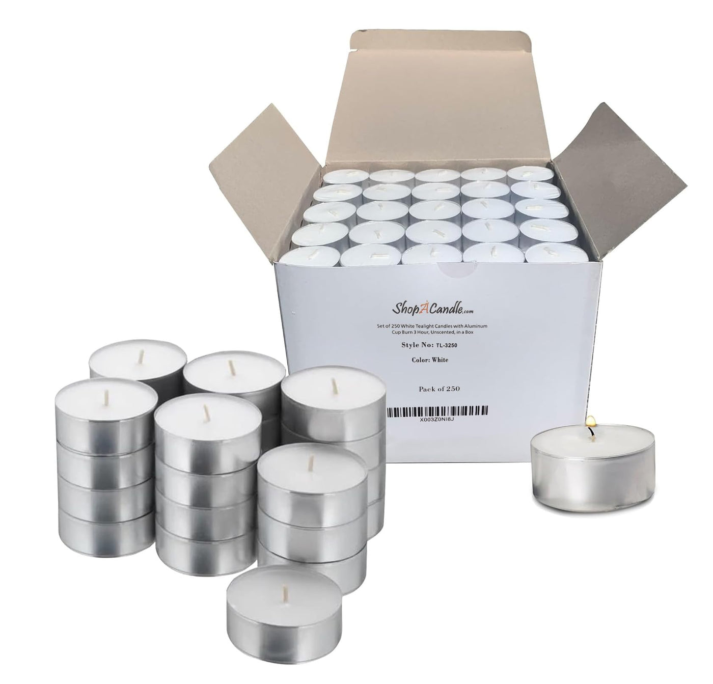 Illuminate Can-Delight Moments with Tealight Candles Brighten every corner of your life with premium collection of white tea lights. Each small candle sits snugly in a metal cup, ensuring stability and ease of placement in a variety of settings, from tealight candle holder to mason jars. Whether you're setting the mood for a romantic dinner, lighting up a cozy lantern, keeping your food warm, or preparing for an unexpected power outage, these bulk candles are your go-to solution. Experience the serenity of clean, soot-free burning with our meticulously crafted candle pack. Our unscented votive candles and tea lights candles promise an ambiance free from clogged nostrils and unsightly stains, ensuring a pure and unadulterated glow. Our long burning candles are designed to last. Crafted from high-quality wax with a lead-free cotton wick, these long lasting candles promise a continuous, steady flame for up to 3 hours. Say goodbye to frequent relighting and embrace uninterrupted warmth and candle light, making them perfect as both romantic candles and emergency candles long burning. Our long lasting tea lights serve as the ultimate accessory for creating a magical atmosphere. Ideal for grand occasions or intimate moments, these small tea light candles transform any space into a haven of relaxation and romance. Product Features Clean Burning Unscented Long Burn Time Soft Glow Wax & Lead-Free Cotton Encased in Metal Cups Fits Most Standard Votive Holders Lanterns Mason Jars Potpourri Burners Luminaries Romantic Centerpiece Other Decorative Holders About Us Discover the world of , where we bring you a diverse selection of candles that effortlessly enhance any atmosphere, decor theme, and occasion. We believe in creating a timeless ambiance that you can share with your loved ones, each flicker of our candles transforms moments into connections and celebrations, enriching the beauty and elegance of your gatherings.