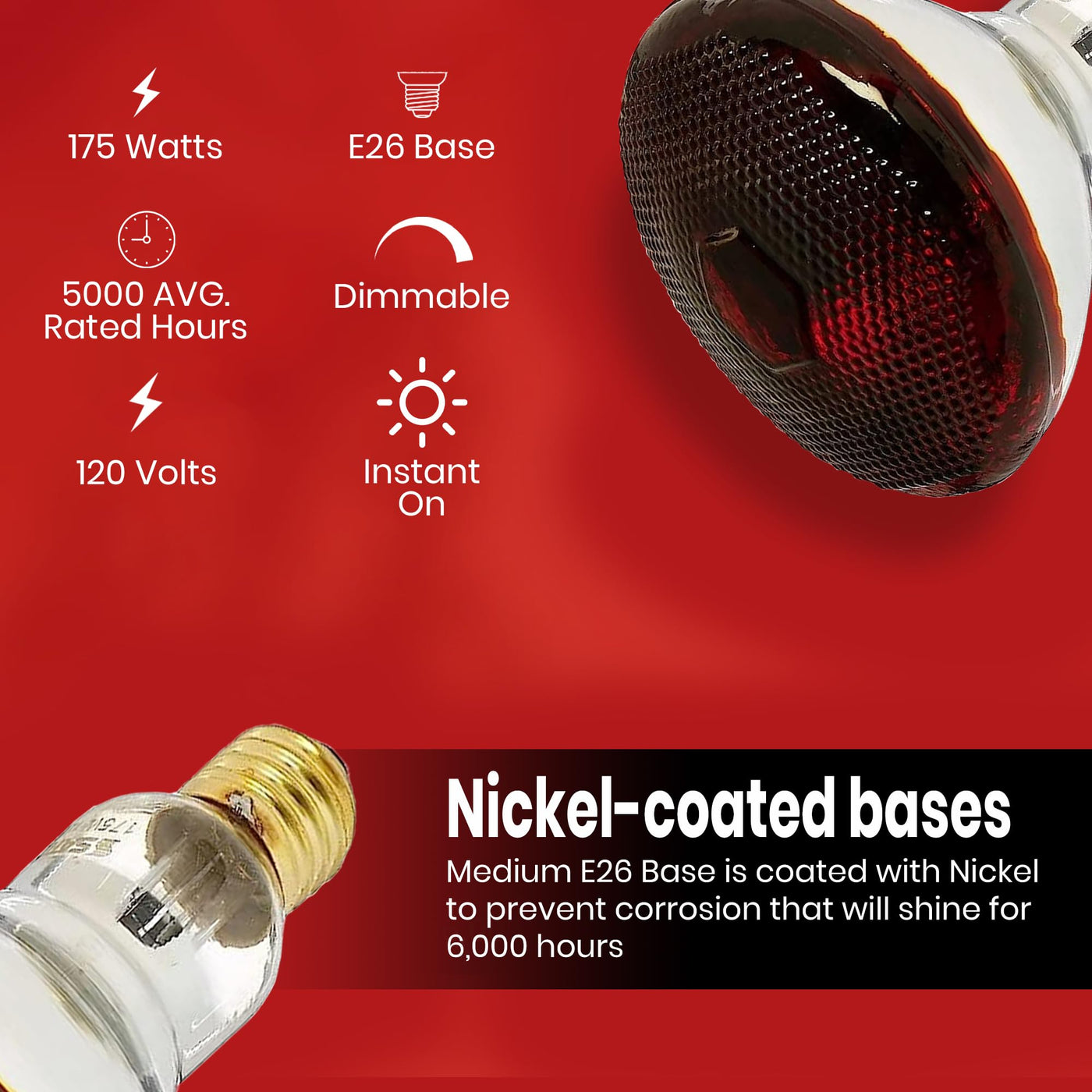 Great QualityThese 250 watt, 120-volt bulbs with Medium E26 base will shine for 6,000 hours and have Nickel-coated bases to prevent corrosion. For uses in homes, offices, and stores. Common uses include Food Service, Bathroom Heat lamps, Brooder bulbs for Chickens and Pets, Sauna and Light Therapy, etc. These light bulbs are dimmable. Pyramid Bulbs 250 Watts Incandescent Medium based R40 heat lamp bulb works with most 120-130 Volt lighting fixtures, This bulb features a Red finish that provides a bright, crisp light. Red heat lamps provides the infrared heat preferred by many food service suppliers, restaurants, hotels and salons. These bulbs are also great for decorative and special purpose lighting applications.