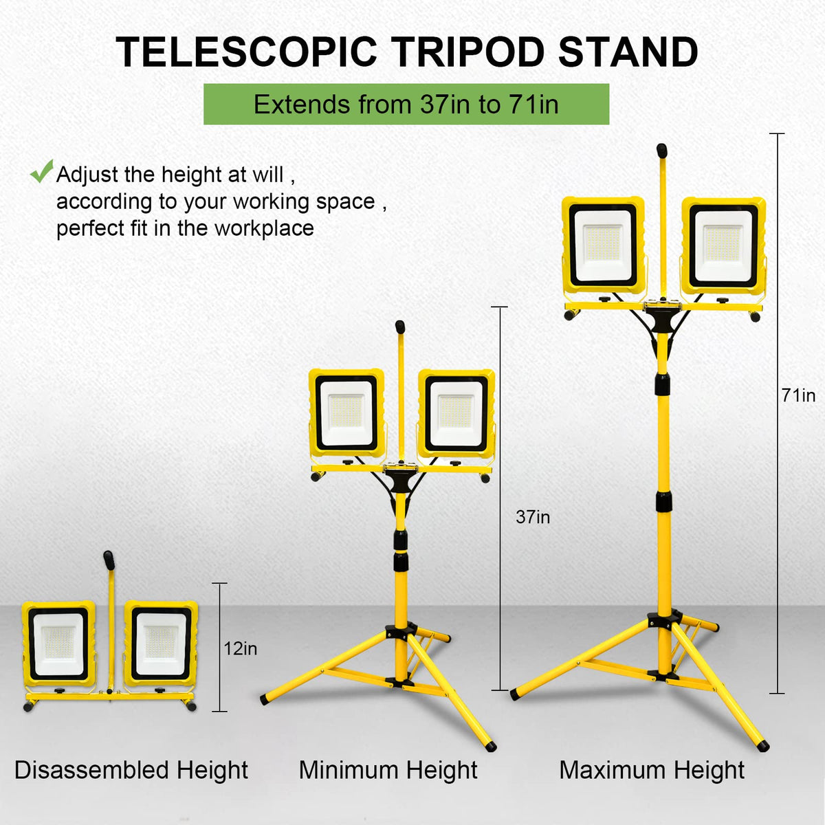 Q: Is the work light adjustable in height and direction?A: Yes, the work light features a telescopic tripod that adjusts from 35 to 71 inches in height, and the twin lamp heads can rotate 360° horizontally and tilt 180° vertically for precise light positioning.
