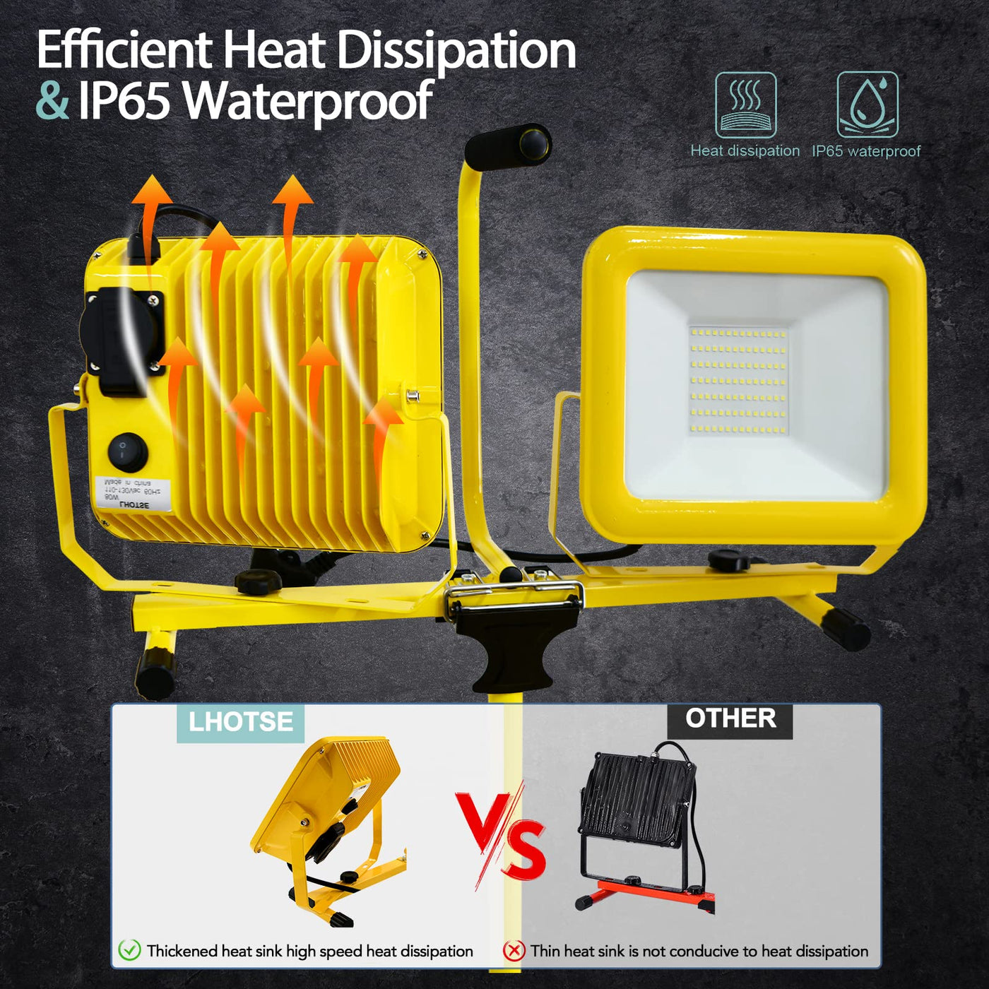 Q: How is the heat dissipation managed in this LED work light?A: The LED work light is designed with a fin-type heat sink to enhance air contact and accelerate heat dissipation, which helps prolong the lifespan of the light.