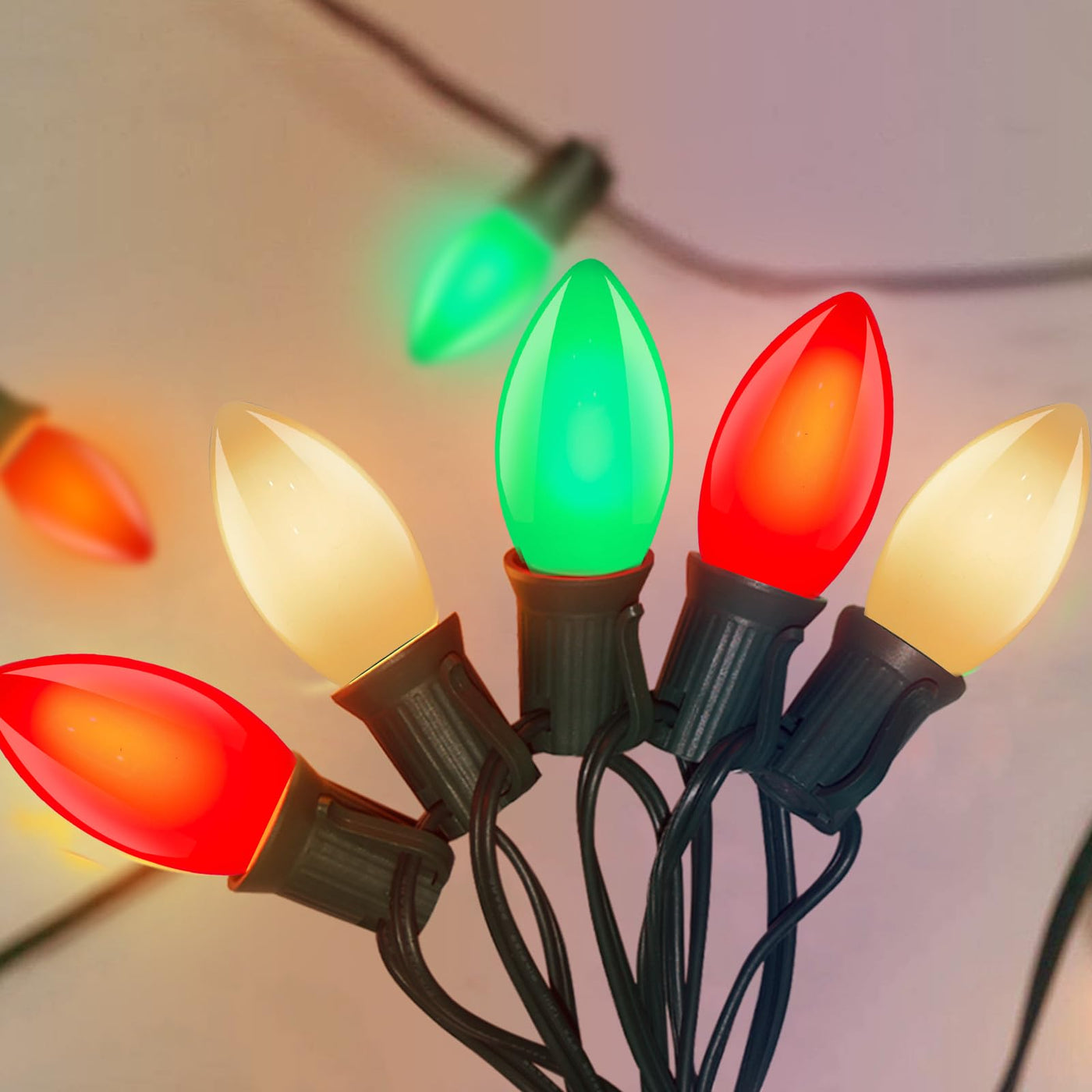 Illuminate Your Holidays With C9 Led Red, White, And Green Christmas String Lights Transform Your Holiday Season Into A Mesmerizing Winter Wonderland With Our Enchanting C9 Led Red, White, And Green Christmas String Lights. These Vibrant And Energy-Efficient Lights Create A Harmonious Blend Of Festive Colors, Setting The Perfect Stage For A Joyous And Memorable Celebration. Efficient And Long-Lasting Led Technology: Our Led Lights Are Not Only Visually Stunning But Also Energy-Efficient. They Consume Minimal Power Compared To Traditional Incandescent Bulbs, Allowing You To Enjoy The Festive Atmosphere Without Worrying About Soaring Energy Bills. These Leds Are Also Designed To Last, Providing Brilliance For Numerous Holiday Seasons. Versatile Decorating: With 25 Feet Of String And 25 Led Bulbs, These Lights Offer Endless Possibilities For Decorating Your Home. String Them Along Your Roofline, Wrap Them Around Trees, Drape Them Over Your Porch, Or Use Them To Create A Stunning Display On Your Christmas Tree. Create Unforgettable Holiday Memories: Whether You'Re Hosting A Festive Holiday Gathering Or Simply Enjoying Cozy Evenings With Your Loved Ones, These Lights Will Set The Perfect Mood And Help Create Cherished Holiday Memories. Specifications: Color: Led Red White And Green Total Length: 25 Feet Connectable: Up To 28 Strings Voltage: 120V Indoor/Outdoor: Yes (Weather-Resistant) Ul Certified: Yes Bulb Type: Incandescent Bulb Bulb Count: 26 Pack(1 Spare Bulbs)Shape: C9 Material: Glass Wire Color: Green Bulb Power: 0.6W Bulb Spacing: 12 Inches Plug To First Bulb: 6 Inches Last Bulb To End Plug: 6 Inches Make Your Holidays Shine Bright With Our C9 Led Red White And Green Christmas String Lights!