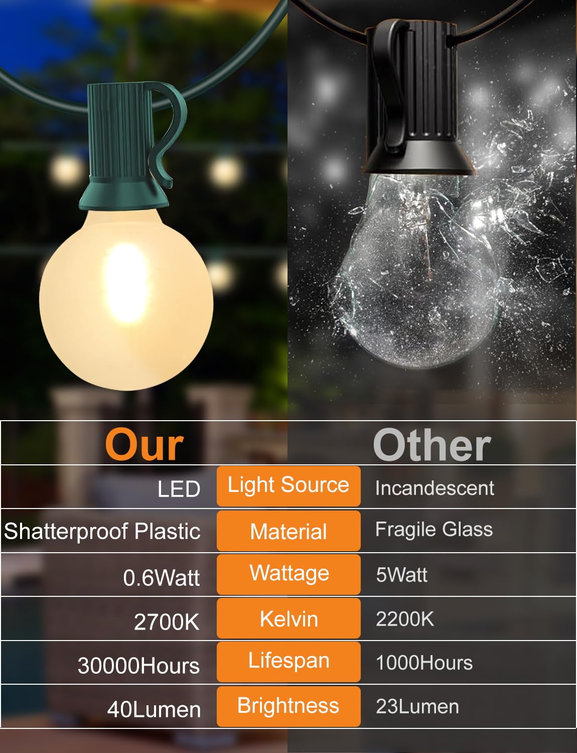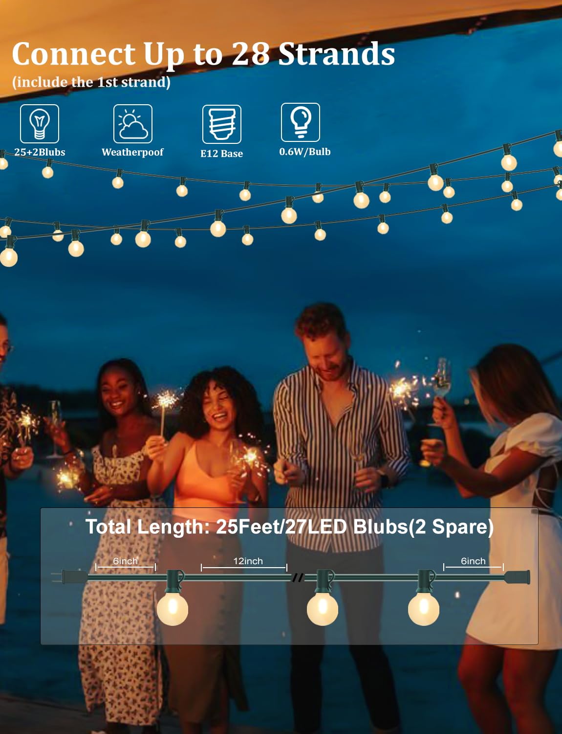 25Ft Globe Christmas Lights Ourdoor, G40 Led Round Christmas Lights With 27 Led Frosted White Lights(2 Spare), Outdoor Christmas String Lights For Yard Patio Garden Balcony Bistro Decor, Green Wire Note: There Are 25 Bulbs And 25 Sockets Per String Lights And 2 Extra Bulb For Replacement. G40 Is The Type Of Bulb, And E12 Is The Type Of Socket. Note : The Distance Between Two Bulbs Is 12 Inches. Bulb Information Source Type : Led Bulb Shape : G40 Bulb Quantity : 27 Led Bulbs(2 Spare) Bulb Width : 1.56 Inch Bulb Life Span : 20,000 Hours Bulb Color : Frosted White Color Temperature : 2700K Dimmable : Yes(Dimmer Not Included) Material Of Bulb Housing : Plastic Bulb Type : E12 Base Bulb Watt : 0.6 Watt Per Bulb,15 Watt Per String Wire Information Plug Type: 2-Prong Plug Input Voltage : Ac 120V Wire Gauge : 20Awg Xtw Wire Color : Green Socket Type : E12 Socket Base Total Length : 25 Feet Bulb Spacing : 12 Inch Plug To First Bulb : 6 Inch Last Bulb To End Plug : 6 Inch Extendable : Connect Up To 28 Strands / 432 Watts Together Maximum Package Includes 1 * 25Ft Outdoor String Lights 25 * G40 Led Frosted White Lights 2 * Spare Bulbs 1 * Spare Fuse (Already Installed In Fuse) 1 * Instruction Manual Cautions : 1. Please Turn Off The Power Before Installation. 2. Don'T Touch The Bulb When It'S Working Or Hot. 3. Please Make Sure That The E12 Base Type Of The Bulb Match Your Lamp Before Placing An Order. Outside Christmas Lights Vintage Christmas Tree Lights Round Bulb Christmas Lights Outdoor String Lights Christmas Lights Outdoor Outdoor Christmas Lights Round Christmas Lights Globe Christmas Lights Globe String Lights Green String Lights Globe Christmas Tree Lights Globe Christmas Lights Outdoor Christmas Lights For Outdoor Christmas String Lights Outdoor Christmas Lights For House Christmas Patio Lights Christmas Porch Lights Christmas String Lights Outdoor Green String Lights Outdoor
