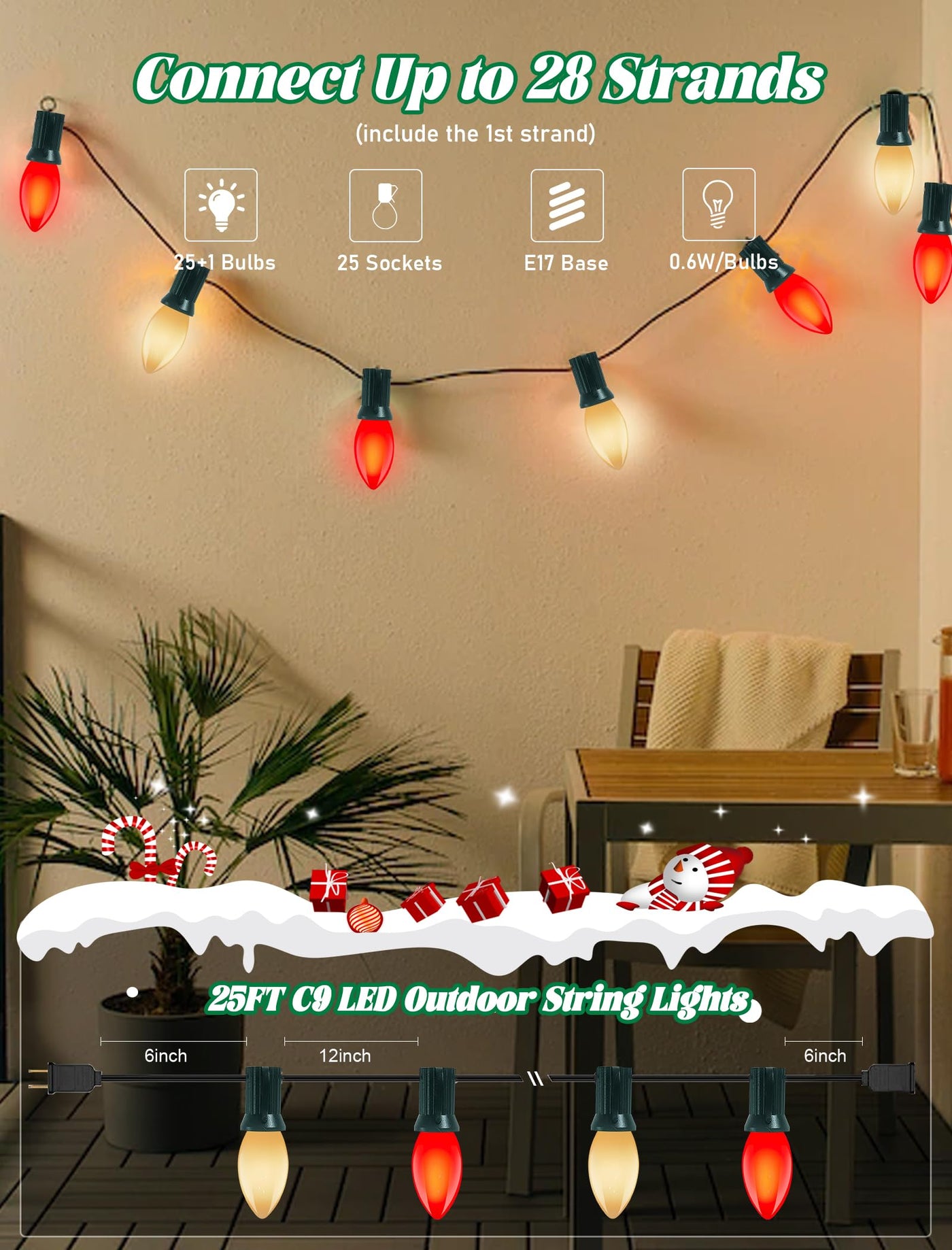 25Ft Led C9 Red And White Christmas Lights Outdoor, C9 Vintage Christmas Lights With 26 Led Red And White Bulbs, Hanging Outdoor
