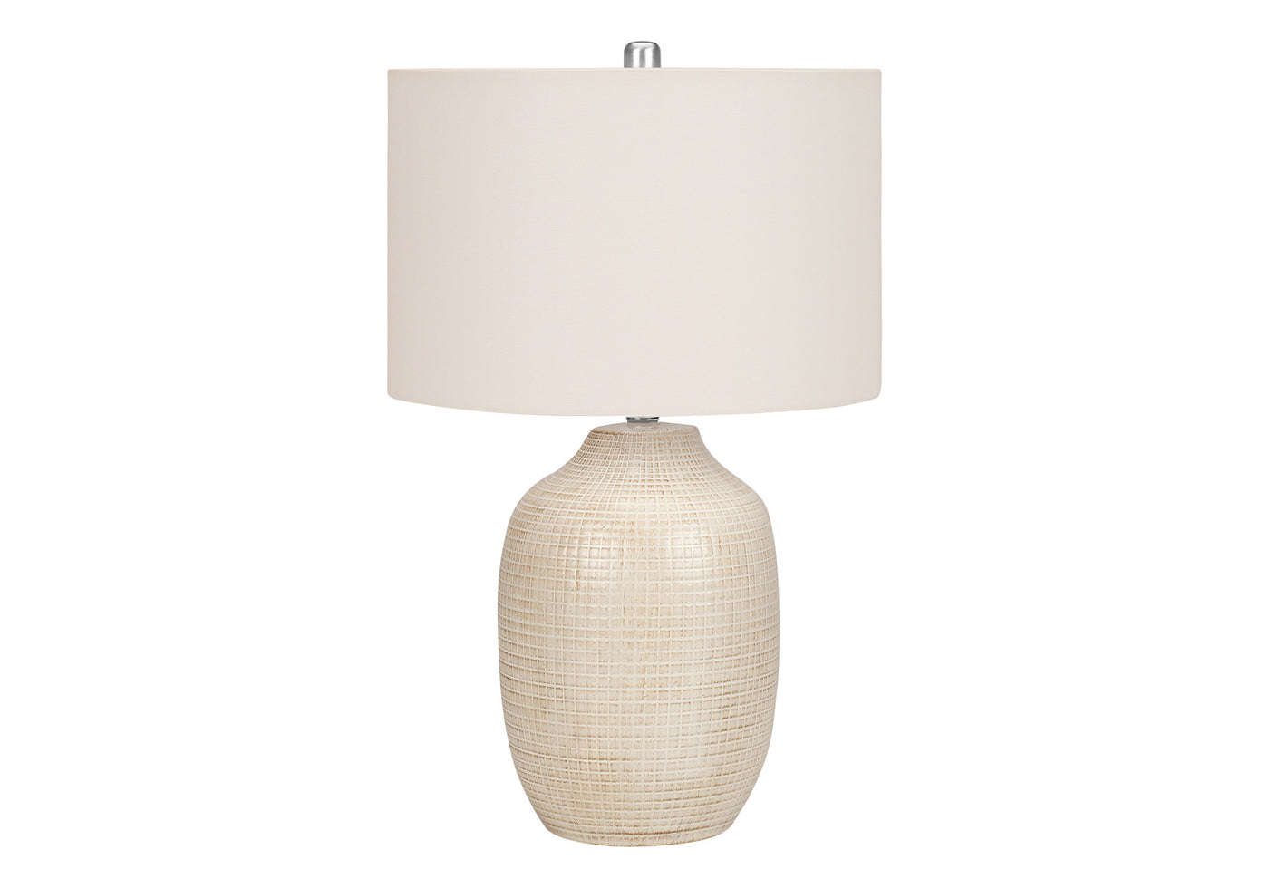 Bring of level of elegance and freshness to your space with this high quality 26-inch cream ceramic urn table lamp with cream drum shade. The base of this lamp is made of a gorgeous cream glazed ceramic with a geo texture design. The ivory/cream shade has a drum shape and is made of linen, which makes it a perfect choice. This standard table lamp is designed to provide general lighting to the area. The light that this lamp throws is soft and warm to elevate the look of most any space in your home. It is perfect for virtually any decor. 25.75-inch H x 16-inch W x 16-inch D