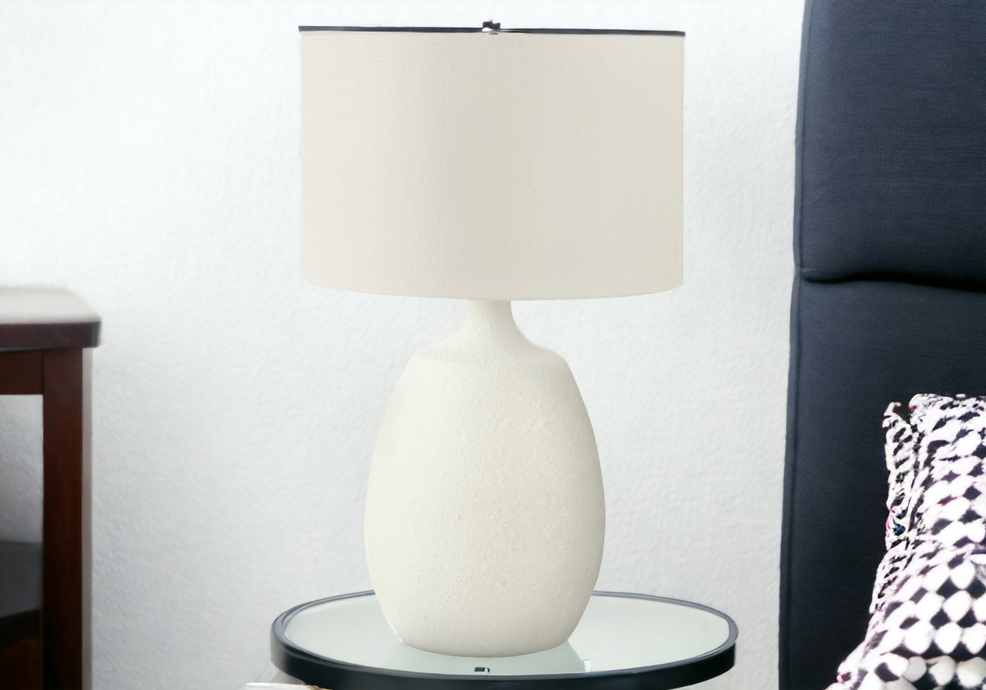 This 26-inch cream gourd table lamp with cream drum shade is the perfect combination of design and function. The base of this lamp is made of polyresin finished in a cream tone. The cream drum linen shade is a great compliment to this lamp. This standard table lamp is designed to provide general lighting to the area. The light that this lamp throws is soft and warm to elevate the look of most any space in your home. The perfect lamp to create just the right natural and soothing light in your space. 26-inch H x 16-inch W x 16-inch D