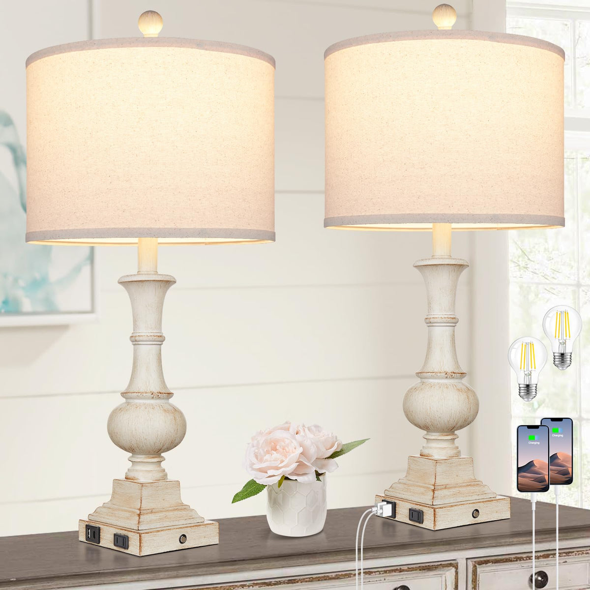 26'' Farmhouse Table Lamps, Table Lamps For Living Room Set Of 2 With Usb A+C Ports & Ac Outlet, Vintage Rustic Touch Control 3-