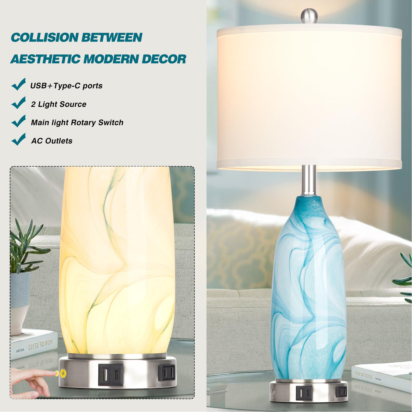 26" Coastal Table Lamps Set Of 2, Modern Table Lamps With Usb A+C Ports & Ac Outlet, Touch Control Glass Bedside Nightstand Lamp With Night Light For Living Room Bedroom End Table Blue(Bulbs Included)
