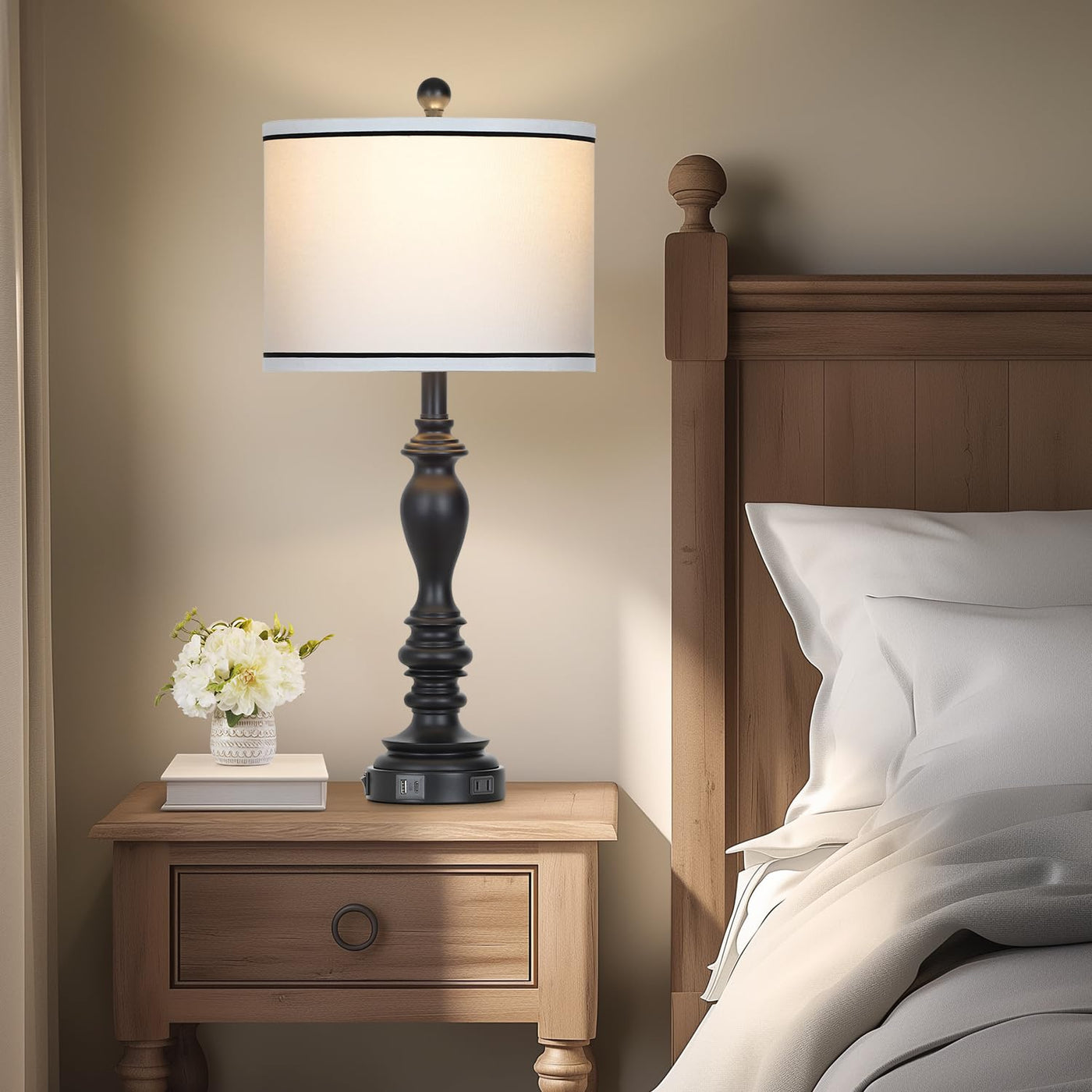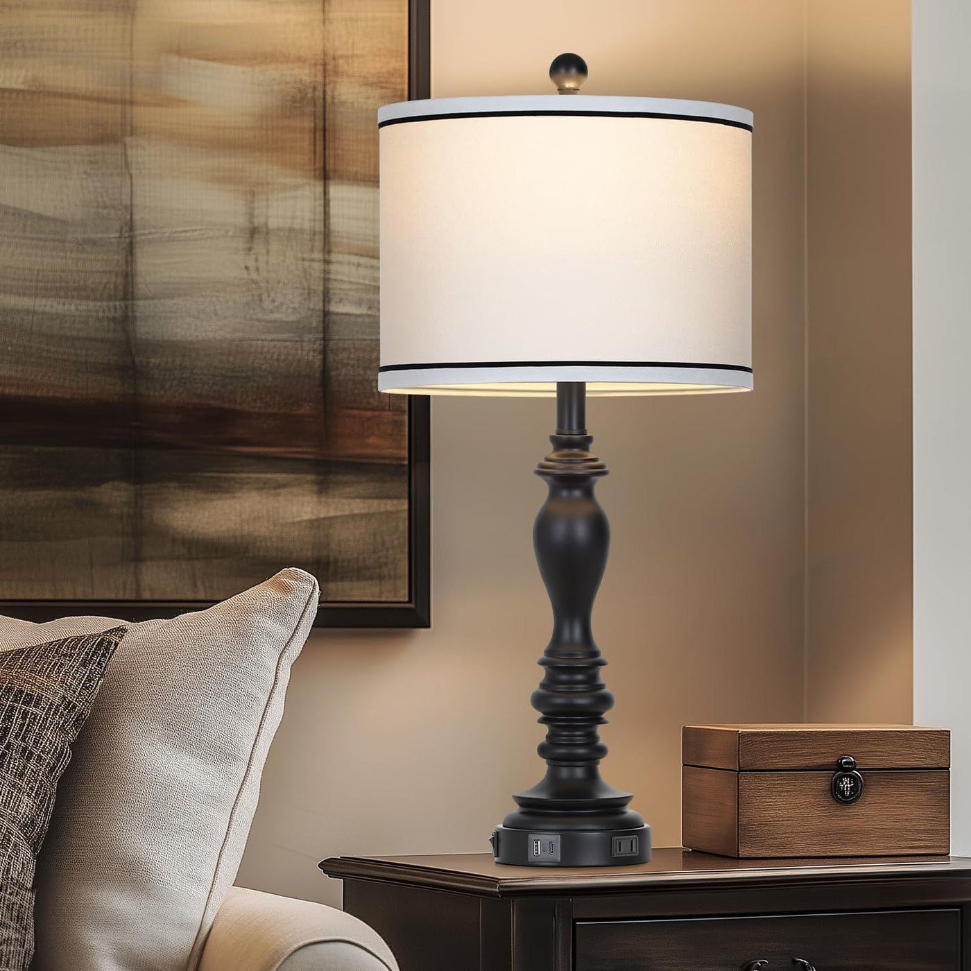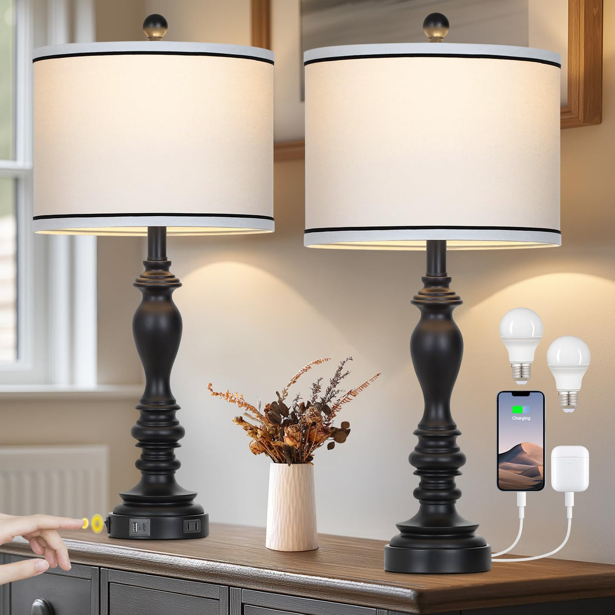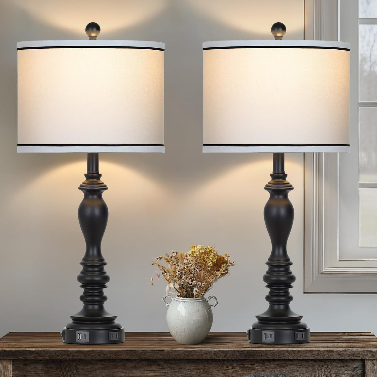 27.5'' Farmhouse Table Lamp For Living Room, Black Lamps Set Of 2 With Usb A+C Ports, Mid Century Tall Table Lamp For Bedroom, B