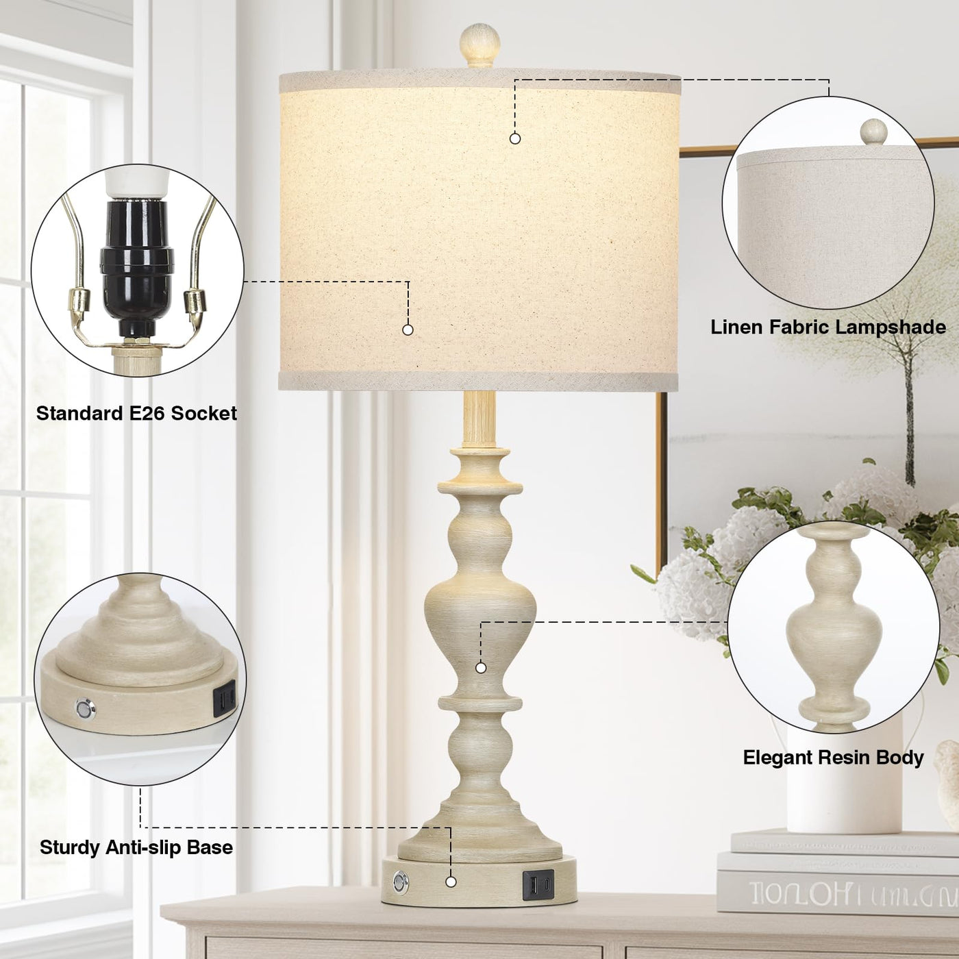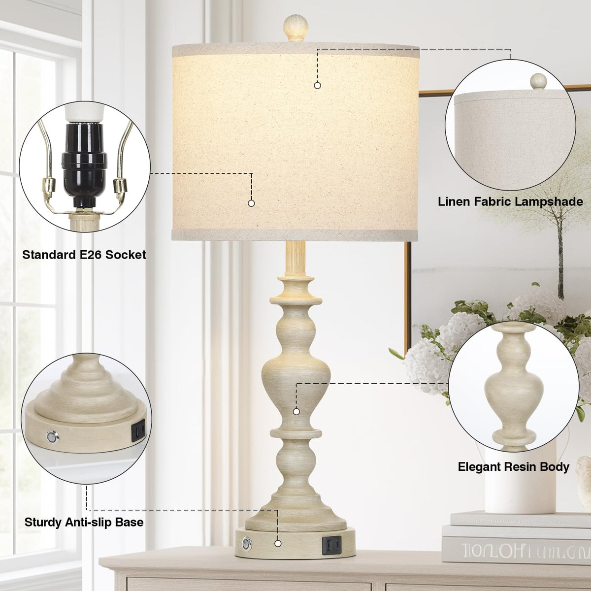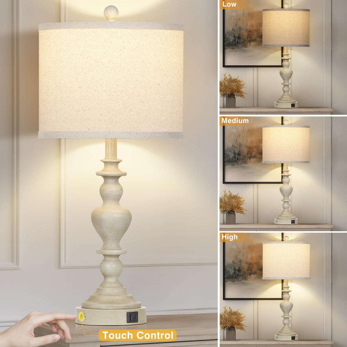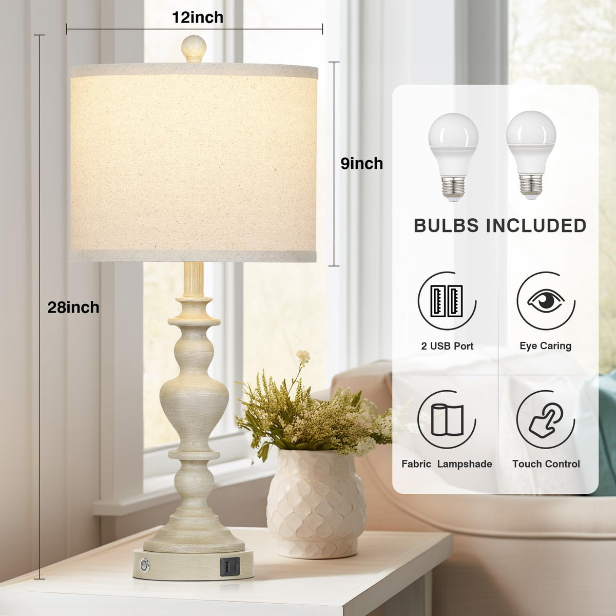 27'' Farmhouse Lamps Set Of 2 With Usb C+A Ports & Ac Outlets, Vintage Rustic Touch Control Table Lamp For Living Room, White Re