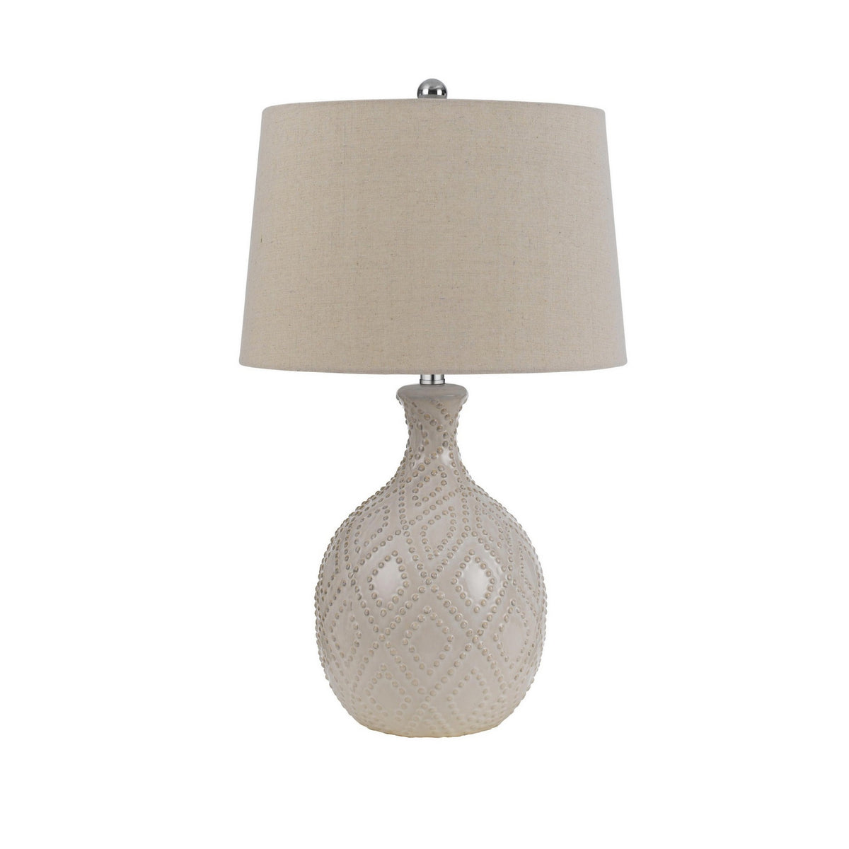 Sleek and stylish, this set of two accent table lamps is here to brighten up your space with a balanced, calm look and warm, inviting light with its convenient three way dimmer switch. The round ceramic base with a studded design makes it a versatile piece while the hardback linen fabric shade adds a subtle but contrasting appeal. The ivory hue compliments the piece and gives flair to your living room, bedroom, office, or den.