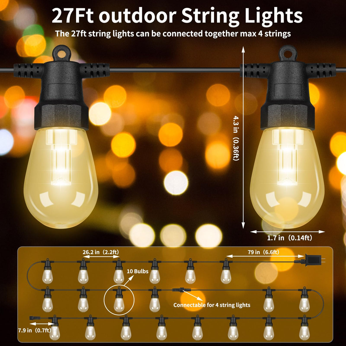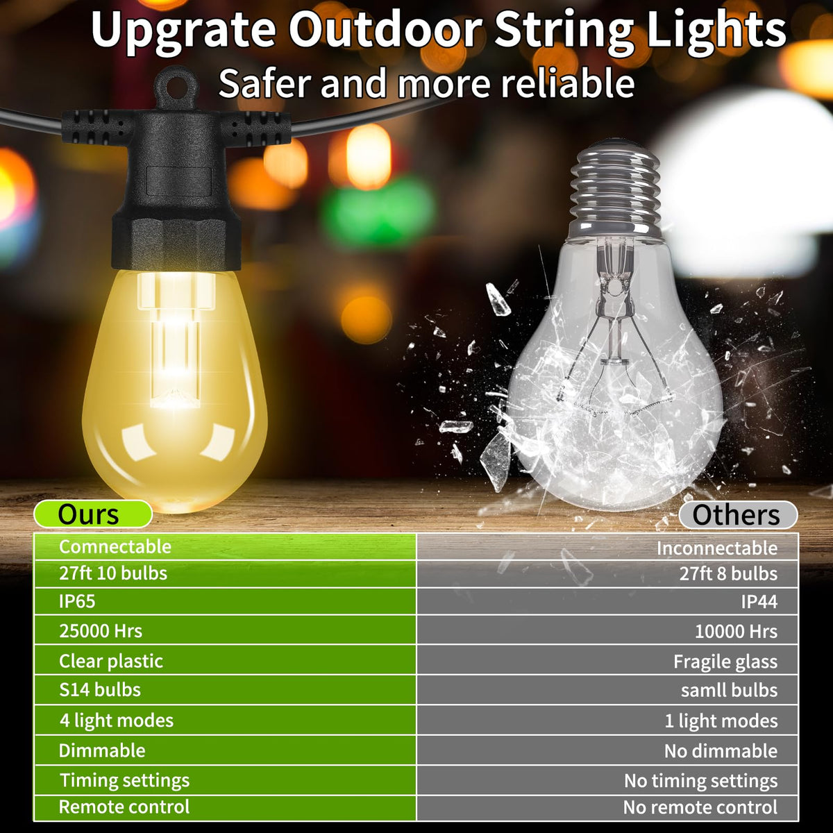 27FT Outdoor String Lights - Patio Lights with Remote, 10 Dimmable Warm White S14 LED Bulbs, IP65 Waterproof Shatterproof String Lights for Outside, Timer, 4 Modes for Patio Porch Garden Camping