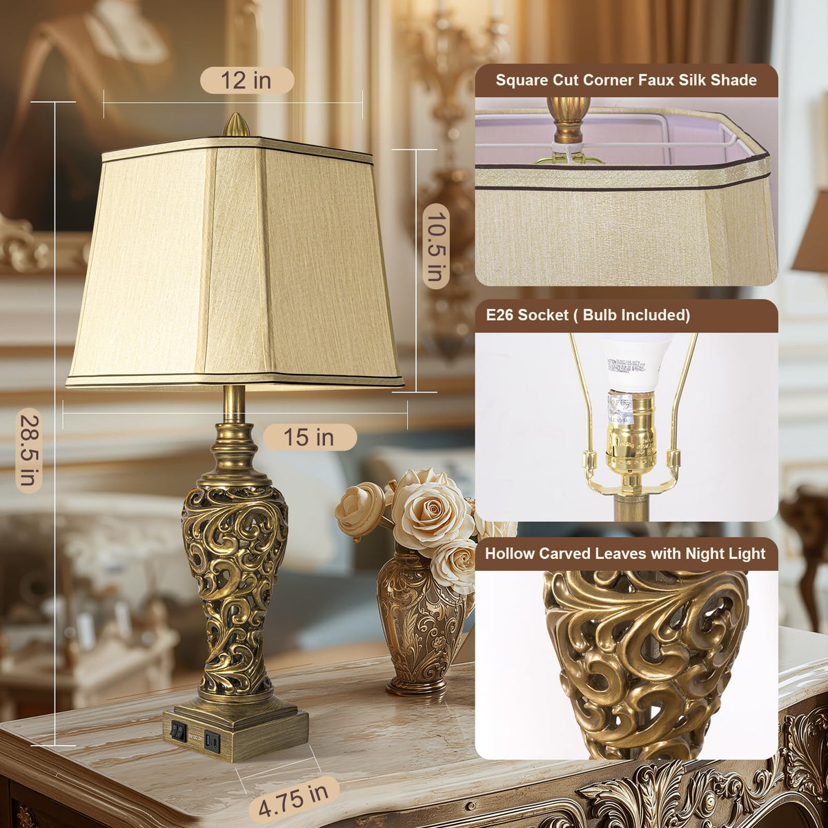Each Vintage Table Lamp Is 28.5 Inches Tall And Features A Soft, Bell-Shaped Faux Silk Shade (15 X 12 X 10.5), Emitting A Cozy And Inviting Light That'S Perfect For Creating A Warm Atmosphere At Home. The Sturdy 4.8 Square Base Helps Save Table Space And Keeps The Lamp Stable. Made From Durable Resin, The Lamp Body Features Beautiful Hollow Carved Leaves And An Antique Brass Finish, Bringing An Elegant, Vintage Touch To Your Bedroom, Livning Room, Or Study. With Built-In Dual Usb A+C Charging Ports On The Base, You Can Easily Charge Two Devices At The Same Time-Even When The Lamp Is Turned Off. It'S Super Convenient For Your Phone, Tablet, Or Kindle By Your Bed Or On Your Work Desk. Plus, The Independent Mini Rocker Switches Let You Control The Main Light And Night Light Separately. Use The Bright Light For Reading Or Working, Or Switch To A Soft, Warm Glow To Create A Relaxing Vibe Whenever You Like.