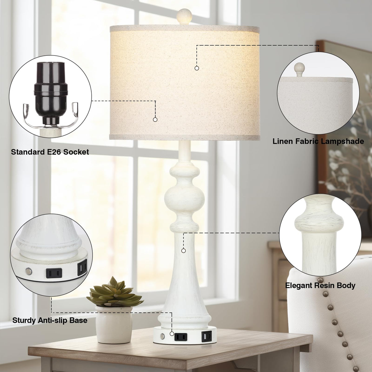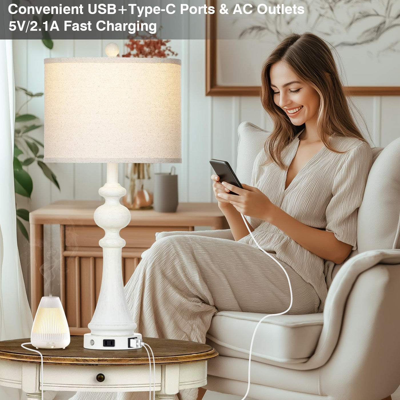 28'' Farmhouse Lamps Set Of 2 With Usb A+C Fast Ports & Ac Outlets, Vintage Rustic 3-Way Dimmable Touch Control Table Lamps, Rus