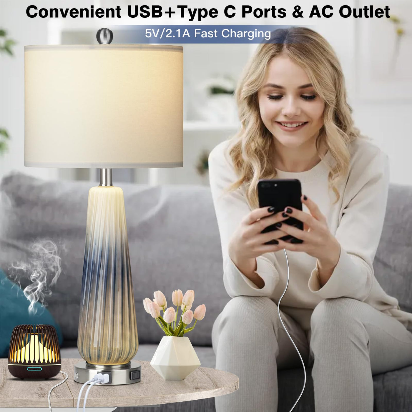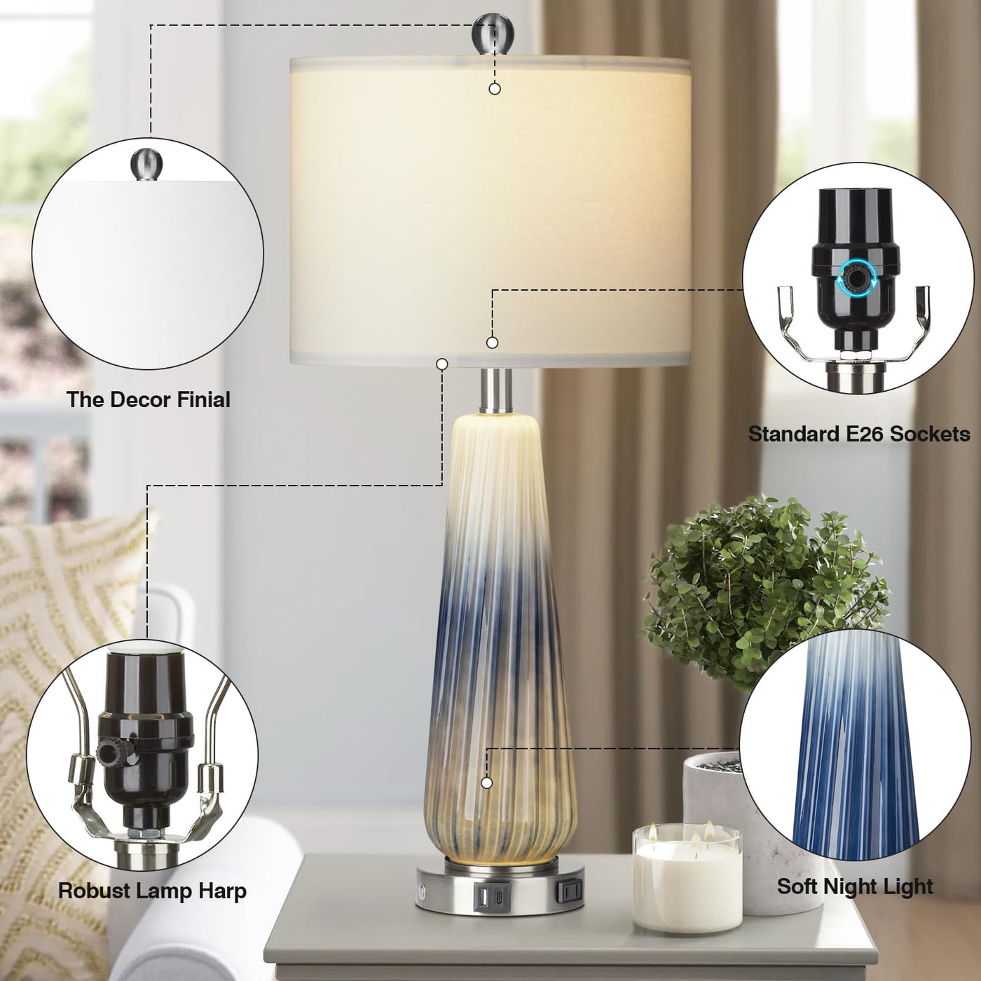 28" Glass Table Lamp Set Of 2, Modern Table Lamps With Usb A+C Ports & Ac Outlet, Touch Control Bedside Nightstand Lamp With Led Night Light & White Fabric Shade For Living Room Blue(4 Bulbs Included)