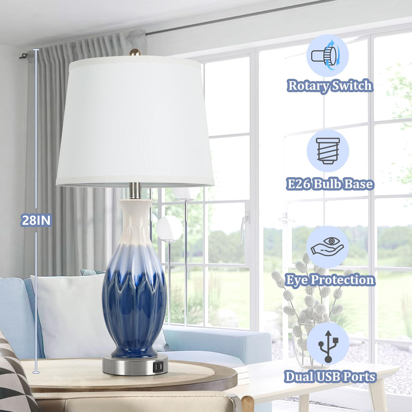 28” Tall Table Lamps Set Of 2, Ceramic Bedside Lamps With Usb Ports, Navy Blue Lamps For Nightstand, Coastal Lamp With White Fabric Shade, Table Lamp For Living Room, Large Bedroom Lamps For End Table